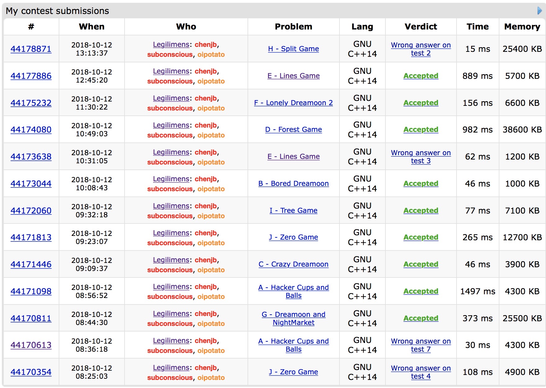 出门sub表示会做J,上机wa了,cjb和yzc讨论了一下A,yzc上机也wa了,之后cjb读了真签到题G,让yzc上了一下'''G1y29''',之后拍了下A,'''A1y41''',之前cjb读了C,让sub准备了一下,'''C1y54''',sub此前也想好了J,'''J1y68'''。cjb开出了I,'''I1y77'''。yzc和sub在cjb写I的时候搞出了D。cjb上机搞定点分治和FFT,sub和yzc继续讨论B,之后yzc上机写B,cjb检查代码,'''B1y113'''。之后sub上机写D,cjb和yzc误会了题意试了一下E获得wa,之后sub '''D1y154'''。cjb此前就提出了F关于偶数的构造,在sub的带领下打表找到构造方法,'''F1y195''',之后一起讨论E,yzc上机写E,不时和sub讨论细节。sub独自想H的细节,之后'''E1y270''',sub上机rush H,获得wa,发现题意有点偏差。