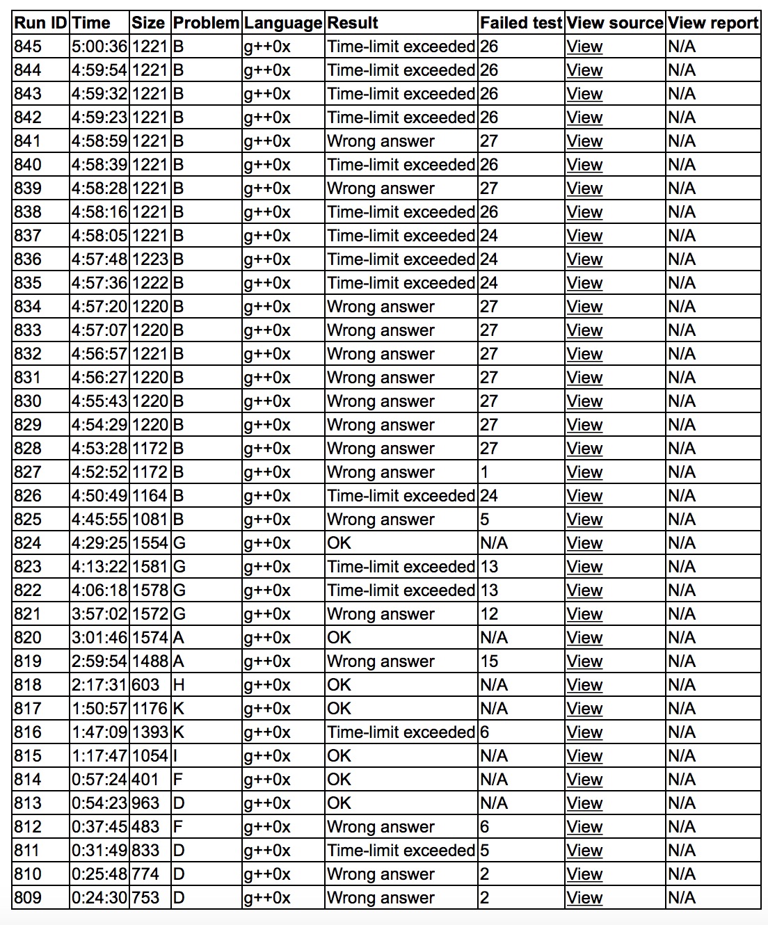出门各自看题,cjb表示会D,上机wa了两发终于tle了,淦。sub上机写构造题F,wa了,淦。cjb换了一种精妙的写法,'''D4y54''',sub找到了问题,'''F2y57'''。cjb和yzc研究I,cjb丢了个做法给yzc,yzc上机'''I1y77'''。cjb和sub此前研究K,然后丢了算法给yzc,tle之后优化了常数,'''K2y110'''。sub上机操作H,'''H1y137'''。sub和yzc研究A,sub给出了牛逼做法,yzc上机'''A2y181'''。cjb和yzc研究G,得到了一种还行的写法,yzc上机又wa又tle,fix了各种bug之后'''G4y269'''。之后sub上机试图表演特技写B,wa27,tle24,tle26,wa27....特技失败。