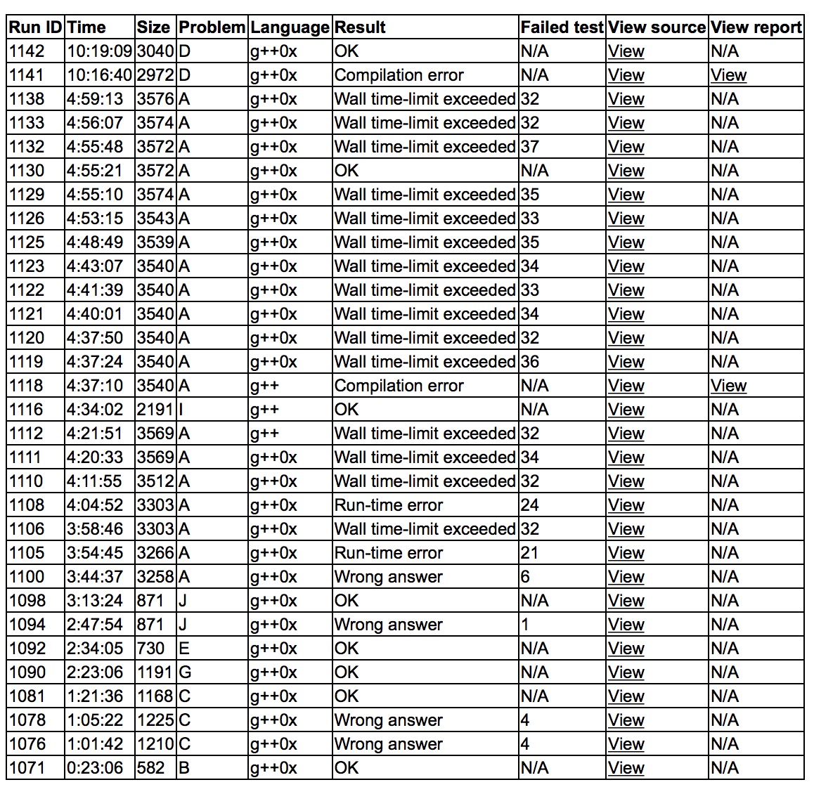 出门各自看题,感觉A很能写,就让yzc上机写A,后发现大家开始过B,cjb上机写B,B1y23,yzc继续写A,写完后发现内存下不来。之后sub和cjb讨论了C,cjb上机写C,wa了2发感觉看不出错,最后yzc发现n-l其实大于n-r,有点无语,C3y81。之后sub上机写E,发现假了,有点自闭,三人又让yzc上去撸A的bitset,后来发现又假了。之后sub想E,yzc推G的式子,cjb想J,之后终于G1y143,E1y154,J2y193。之后三人又决定开始搞A,然后yzc想到了怎么缩减内存,上机写A,sub想I,cjb继续想D,然后yzc写完wa了,拍上debug了之后得到了Wall Time-limit Exceeded???非常自闭,各种调整,在32到36的case来回滚动,sub抽空上机写I,I1y274。之后三人开始疯狂艹A,感觉稳得一比,交了大概16发后,居然得到了一发ok,A16y295。