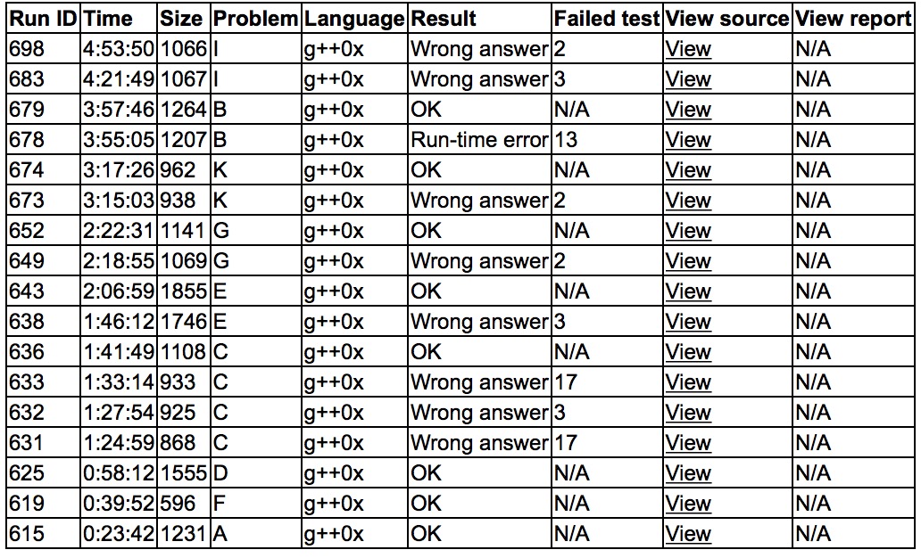 出门各自看题,yzc读了A感觉可做,上机'''A1y23''',sub上机写F,'''F1y39''',cjb读了D,经典的数字打架,丢给yzc,然后cjb写了个checker,'''D1y58'''。之后cjb上机写C,感觉不太行,加了几步调整,'''C4y101'''。cjb和sub讨论了E,sub上机写E,'''E2y126'''。cjb和yzc讨论G,yzc上机'''G1y142'''。cjb和sub讨论K,'''K2y197'''。最后发现B是原题,经典的长链剖分,'''B2y237'''。试图艹I,咕咕。