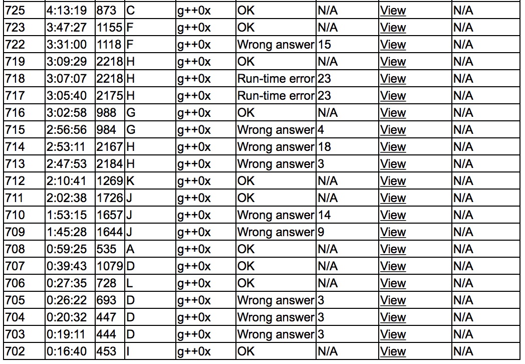 出门各自看题,yzc '''I1y16''',cjb上机写D,wa了之后发现有corner case,wa了3发,sub上机写L,'''L1y27''',之后'''D1y39'''。三人讨论A,'''A1y59'''。yzc上机写J,'''J3y122'''。cjb上机写K,'''K1y130'''。之后cjb继续上机写H,wa了两发很难受。yzc上机写G,'''G2y182'''。sub帮忙查H,终于查出问题,'''H5y189'''。sub和yzc讨论好F,上机'''F2y227'''。之后sub上机写C,'''C1y253'''。