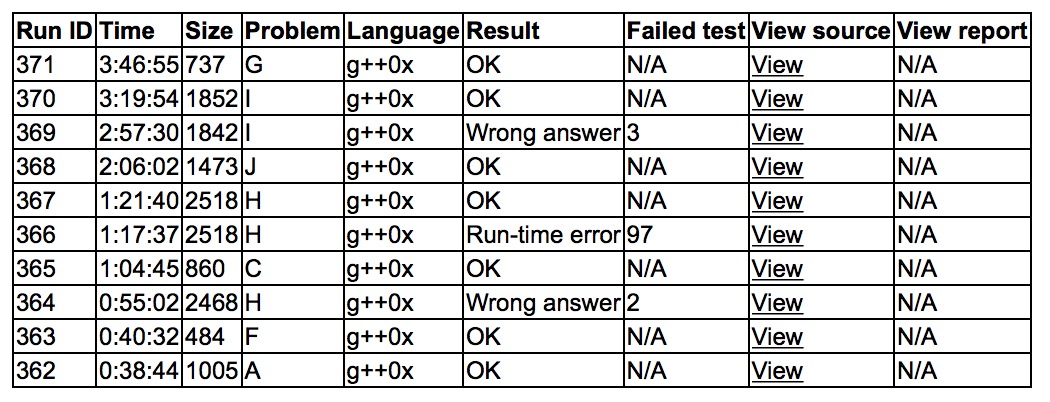 出门各自看题,H是segment beats,让yzc上机写着。cjb读了A和sub讨论了一下,sub丢了个转化,cjb上机试图把log丢掉,后来发现很麻烦,大力sort,'''A1y38'''。yzc和sub讨论F,'''F1y40'''。yzc继续写H,wa了。cjb上机写C,'''C1y64'''。yzc上机拍H,re之后,cjb表示数组可能开小了,改大之后'''H3y81'''。cjb丢了个口胡的J给yzc,在sub帮助下,yzc上机写J,'''J1y126'''。之后cjb上机抄NTT,然后sub上机写I,写了许久,wa3很难受,cjb表示数组又可能开小了,改大之后'''I2y199'''。此前cjb和yzc讨论了G的性质,之后让sub推式子,'''G1y226'''。