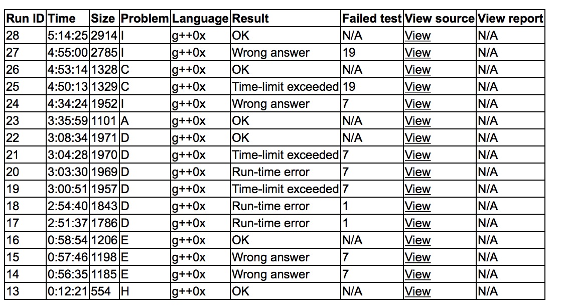 出门各自看题,cjb读了H,和sub讨论了一下,H1y12。cjb和yzc讨论E,E3y58。之后各自开题,三人讨论A,cjb开D,之后sub上机写A,被cjb换下来写D的暴搜,RE1,感觉数组开大了,之后变成TLE,把vector改成链表,死都过不去第7个点,之后cjb读代码,发现有个<=打成了<,改了之后D6y188。sub继续上机写A,发现做法错了重写,A1y215。cjb和yzc讨论I,yzc上机写I,获得wa,写了拍。cjb和sub开出了C,yzc下机查错的时候cjb和sub交替上机rush C,tle了之后cjb发现sub用错了自己的一个变量, 修改后C2y293。之后rush I,发现构造出了问题,很凉,结束后看题解,发现只差一点,修改后AC。