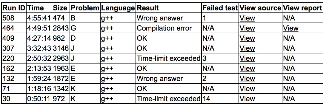 出门各自看题,大家都在刚J,罚时疯狂上升。MIPT过了K之后让sub去搞K,cjb和yzc搞E,之后sub上机tle,yzc上机写讨论出来的一个假算法,之后发现假了。sub想好怎么优化K,'''K2y78'''。sub下机帮忙证明了E的新做法复杂度是正确的,'''E2y133'''。sub期间开始搞J,先让cjb抄了个PollardRho,然后tle了,此前解决了G的复杂度问题,所以只要有空就让yzc上机写G,之后sub想好了J,上机'''J2y212'''。yzc继续写G,sub推D的积分,cjb翻了个积分表,一切似乎都很美好。之后sub '''D1y267''',yzc继续写G,发现少了一维状态,最后讨论B,似乎得到了一点思路,4题收尾,全场rk7,敦老师6题rk1,2-6名都是5题,分别是学军、MIT、MIPT、UW和搞笑网友。