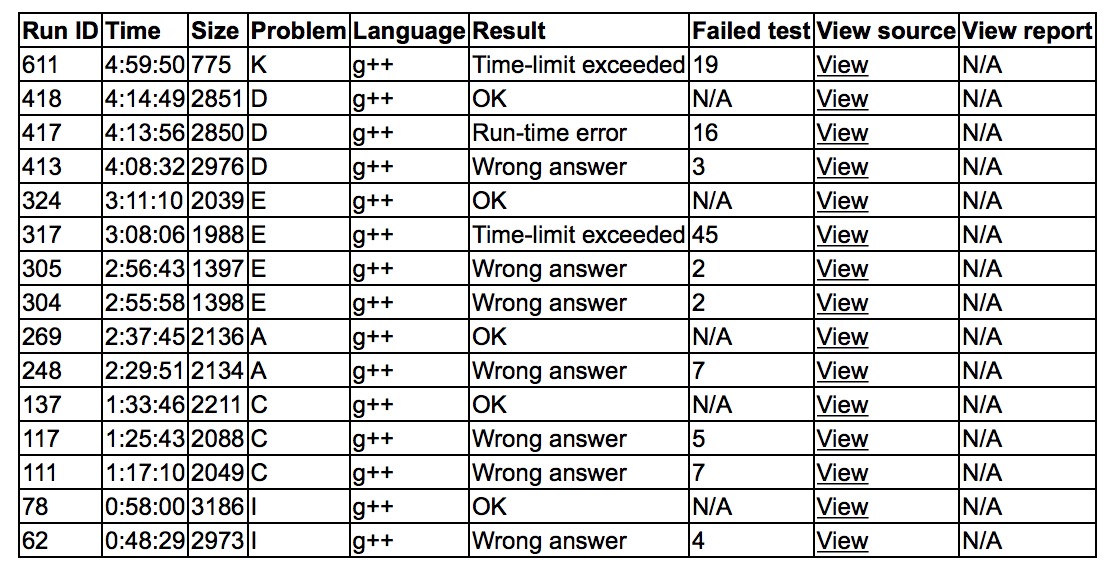 出门各自看题,读了大部分的题目,sub试图上机写C,写了一点之后下机思考,cjb开出了I,上机写I,wa了之后艹了一下发现没有初始化一个数组,修改后'''I2y58'''。sub上机写C,'''C3y93'''。cjb上机写D,sub和yzc推A,之后D做法假了,yzc上机开始写A,'''A2y157'''。之后无题可做,只好让yzc试下E的水,wa了2发之后tle了,之后random_shuffle了一下枚举顺序居然过了,'''E4y191'''。之后cjb终于开出了D,sub确认了做法,cjb让yzc抄了个欧拉回路之后上机,样例炸了之后自闭,sub上机搞了搞发现了小问题,'''D3y254'''。最后时间啥都做不了,sub上机写了个K的暴力t了,最后5题rk9,MIT和MSU神仙打架8题,dls回来打酱油7题,UWr1今天意外地神勇6题,搞笑网友6题,然后jsb 5题凭借良好罚时rk6,sjtu1 rk7,buaa1 rk8。