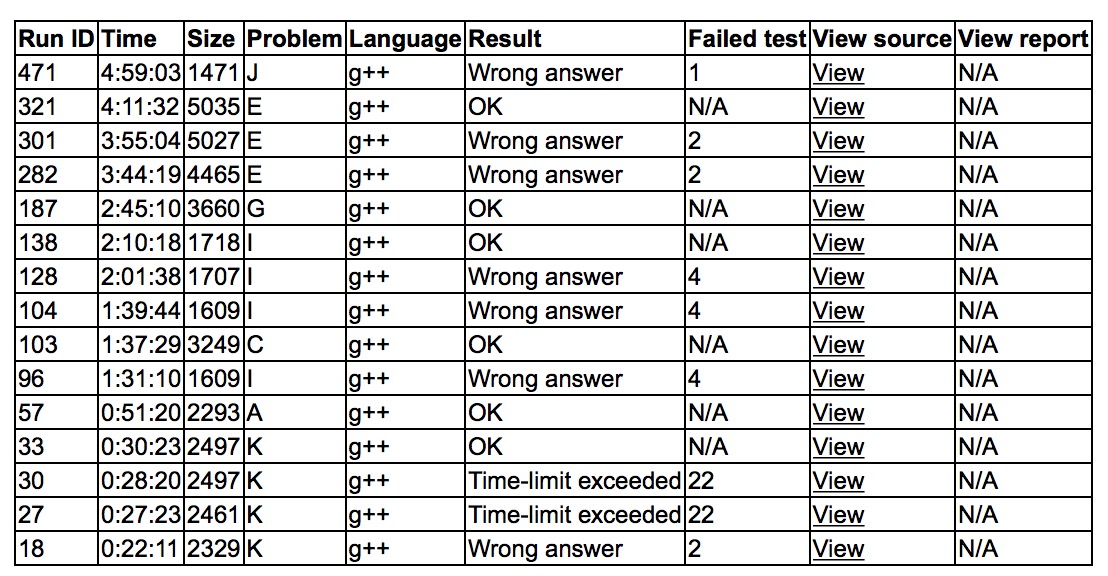 出门各自看题,A和K两个板子题出现了,cjb上机敲板子,然后让yzc上去补全,出了点偏差'''K4y30''',之后cjb上机敲板子,yzc上机'''A1y51''',sub上机写I,cjb想到了C,上机C,'''C1y97'''。sub I wa了之后开始拍,'''I4y130'''。cjb苦思G题无果,然后在板子上找到了….于是cjb上机,花了很多时间,'''G1y165'''。期间yzc和sub讨论清楚了E,开始上机写E,cjb想F,sub推B,一个小时过去了,yzc wa了2发之后下来查,sub上机try B,感觉收敛十分垃圾没有什么救,20min过去了,yzc表示自己找到了1个错,fix了之后'''E3y251'''。最后只好开始刚J,sub有了思路,写不完了,最后rk3,MIT 8题rk1,UW1 7题rk2。