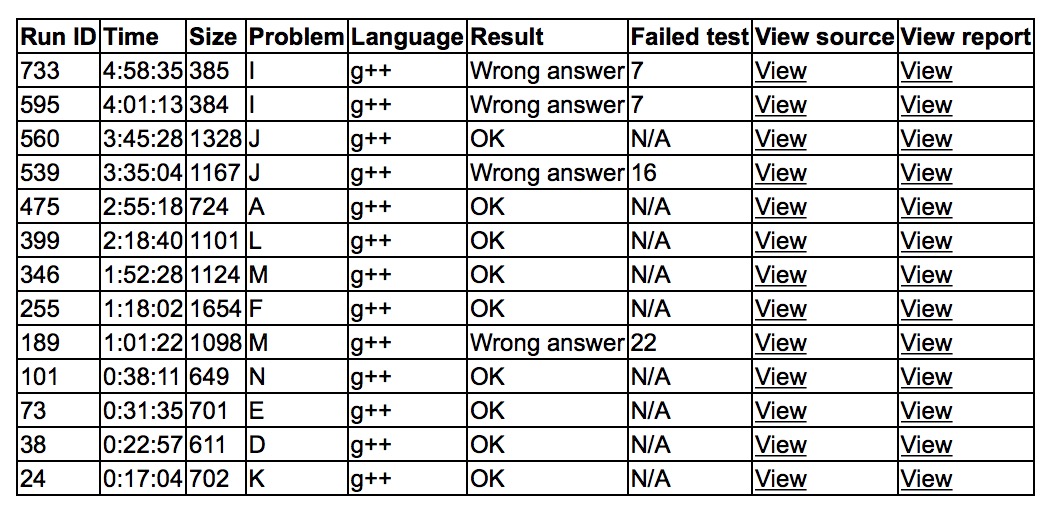 出门各自看题,三个人轮流上机K1y17,D1y22,E1y31,N1y38,M wa了一发之后F1y78,cjb让yzc去对拍,M2y112,sub想好了L,上了厕所后回来L1y138,签到结束。开始做别的题,发现A是弦图后,推了一会儿,让yzc上机A1y175。之后三个人一起讨论J,出了之后让yzc上机,cjb和sub做I,wa了之后发现有问题,J2y225。sub推了个结论上机wa7,之后一直推,总过不了样例,cjb和yzc试图做C,也没救。
