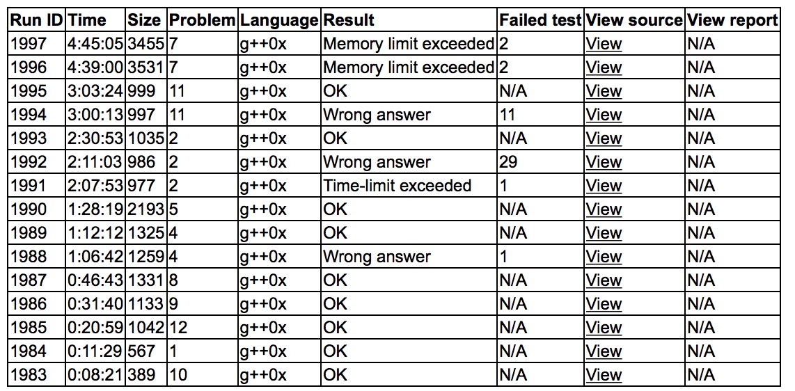 出门各自看题,cjb坐在机上,先签了个J1y8,然后又签了个A1y11,之后抄了个kmp L1y20。yzc接了sub丢过来的I,I1y31。cjb开了个H,丢给yzc,H1y46。cjb接了个sub丢过来的D,D2y72。yzc理清了E,上机写E,E1y88。yzc开K,sub和cjb开B,sub上机B3y150,yzc上机搞K,在sub帮助下K2y183。cjb期间把F的暴力写好验证了dp方程,然后推出了G的答案上界丢给sub,yzc单开F,之后两人先后上机,yzc发现算法不太对,sub写到了最后MLE了2发。