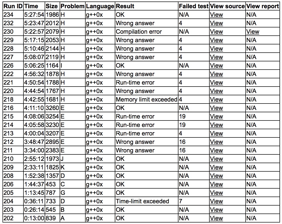 出门各自看题,sub丢了算法给cjb,发现假了,yzc上机A1y13,然后cjb写D又假了,yzc上机B1y26,sub上机写G,G1y73。cjb上机写K,然后yzc和sub研究C和D,之后C1y104,D1y112。cjb写完了K,K1y153,yzc上机J1y175。之后cjb和yzc搞E,疯狂wa之后各种corner case,E6y251。sub想H和I,cjb想到H之后上机开始写,sub也想好了I,疯狂rush,最后赛后6min过I,27min过H。
