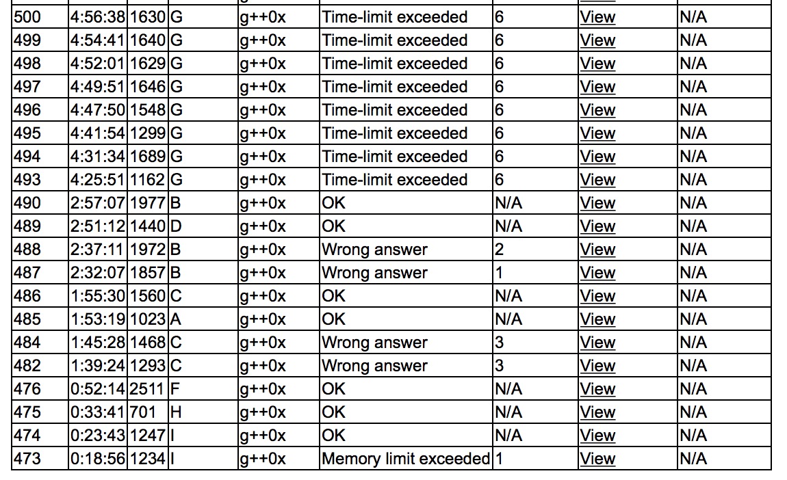 出门各自看题,cjb开F,yzc开I,sub开H,yzc上机忘记return函数值,结果I2y23,sub上机H1y33,cjb上机F1y52。sub和yzc讨论C,之后yzc上机,wa了两发,换sub写A,A1y113。yzc发现了bug,C3y115。cjb上机写B,wa了两发,yzc和sub讨论之后上机写D,D1y171,B3y177。yzc上机验证G的结论,然后sub上机dp,tle后一直卡常,卡到赛后才过。