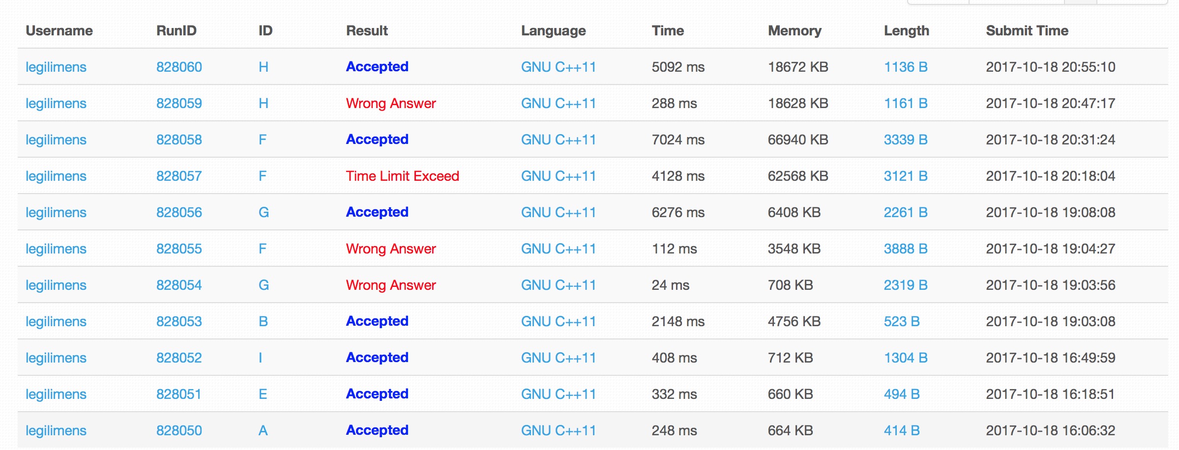 开场各自看题,yzc上机写A,A过. cjb和sub推E,E过. cjb和sub讨论了一下F,感觉大部分都是对的只差关键的一步,cjb先上机写F,yzc和sub讨论I,很快得到了做法,yzc上机写I,I过。接下来两个小时时间,bnuoj坏掉了....sub独自推出了B,cjb想到了F的做法,上机写完了F,yzc和sub讨论好了G,上机写G,后来发现并查集不太行,cjb上机敲了个lct的板子,G也搞定了。两个小时过后,bnuoj终于能上了,连交三题,B过,F和G都wa. yzc看自己G的代码,很快发现bug,修改后提交,G过。yzc帮助cjb写了对拍,cjb发现做法有问题,打了补丁,还是不太行,最后cjb想到了正确的做法,写完获得tle,把spfa换成bfs后提交,F过。最后一个小时,yzc和sub在半猜半推做H,yzc上机写树型dp,sub在旁边调整式子,wa了一发后,最后5min H过。最后7题排在第6,Tazof也是7题排在第3,qls 8题rk1,如果没有两个小时,我们应该7题第一问题不大,但主要以适应中国题目为主,排名其次。