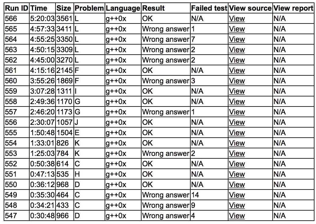 出门各自看题,cjb很快在yzc和sub的帮助下写D,wa了,yzc上机写C,wa了,之后sub发现问题,'''D2y36'''。cjb发现H是做过的构造题,'''H1y47''',yzc发现问题'''C1y50'''。cjb丢了K给yzc,'''K2y93'''。sub一直试图手推E,cjb让他丢了自己上去写随机增量,'''E1y110'''。之后cjb和yzc开了J,会做之后cjb上机'''J1y150'''。sub和yzc开了G,yzc上机'''G2y169'''。cjb很早就和sub商量好了I,sub上机'''I1y187'''。之后sub和yzc开F,大力猜想结论之后上暴力dp,wa了之后assert帮助下yzc查了个错误,'''F2y255'''。cjb上机rush L,结果因为板子的支配树有个变量名字错了wa到了比赛结束,sub一直思考B无果。