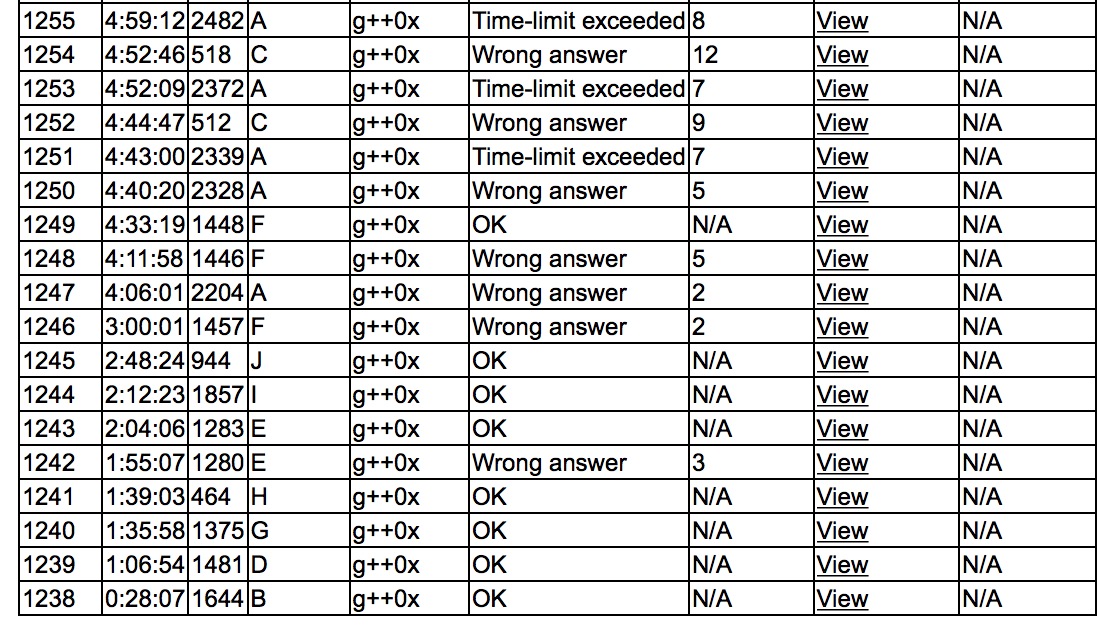 出门各自看题,cjb读了E丢给sub,然后想F。之后有人过B,和sub确认了做法,cjb上机'''B1y28'''。yzc和sub推D,然后上机写D,'''D1y66'''。cjb决定上机乱搞G,让yzc暴搜搜出了规律,之后贪心了一下'''G1y95'''。sub上机写H,'''H1y99'''。然后sub继续写E,cjb和yzc开了A和I。sub挖了之后cjb上机写树剖,之后sub '''E2y124'''。yzc上机写I,'''I1y132'''。sub上机写F,cjb和yzc开出了J,抽空上机写了一下'''J1y168'''。sub F比较踉跄,wa了之后查了很久,yzc上机写A,也wa了。抽空sub推了C的式子,最后F终于'''F3y273'''。yzc的A拍了之后变成了tle,很难受,sub写的C wa12。直到赛后终于过了C,A一直在tle,因为复杂度都是线性的,感觉被卡常卡得很憋屈。