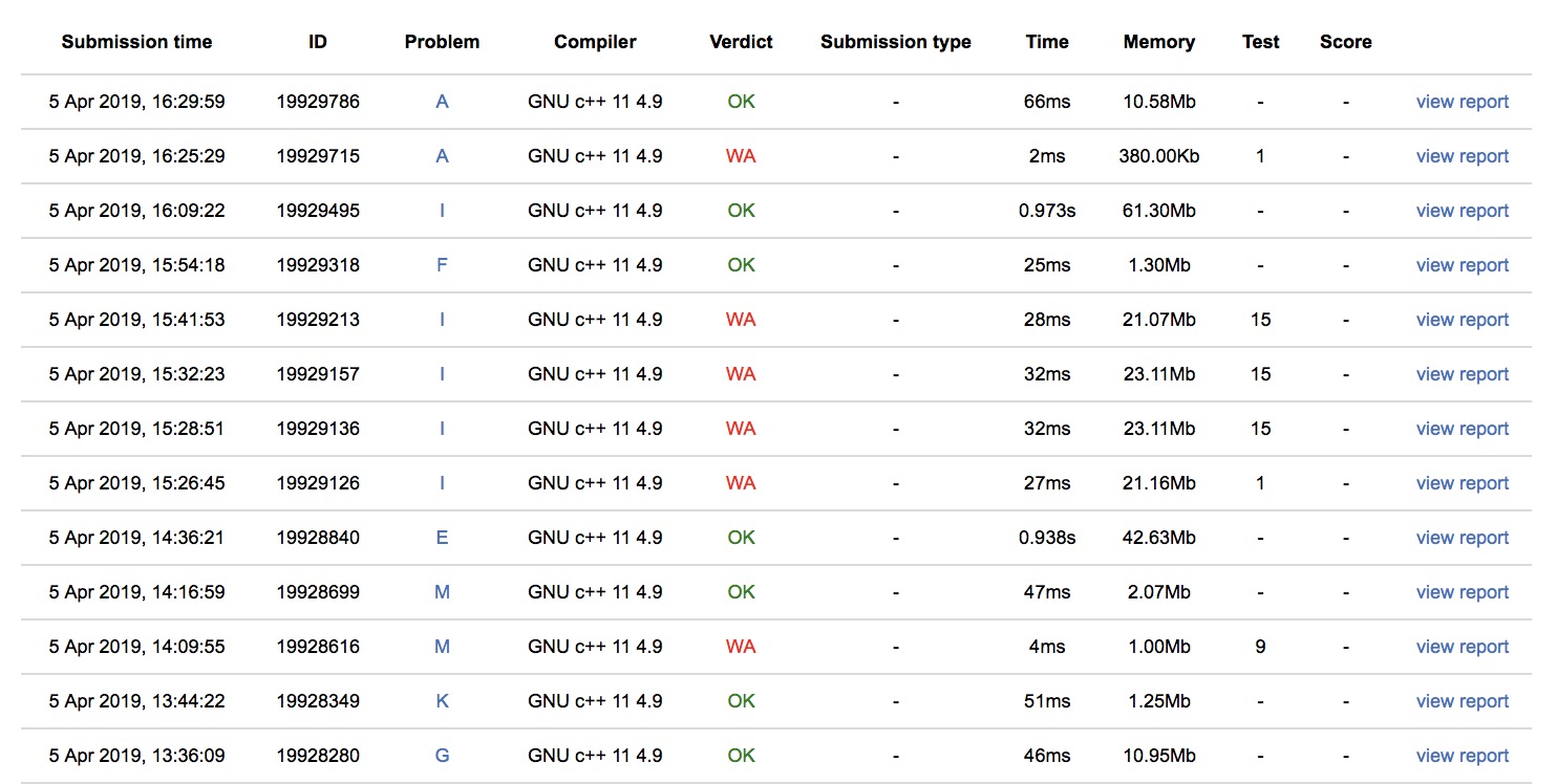 出门各自看题,有人过G,三个人讨论了一下之后想让cjb抄三元环,cjb表示???决定上机手写暴力,G1y39。之后yzc上机K1y47,之后发现I的做法假了,sub会做M了,先上机写M,M2y79。cjb和yzc确认好做法之后,yzc上机写I,中途cjb会做E,sub会做I,抽空cjb上机E1y99,I 疯狂wa,各种查错,sub上机F1y177,最后I5y192。三个人一起讨论A,最后感觉是sam改一改,之后A2y212。sub试图做J,cjb和yzc试图开其他题,GG。最后rk 5,MIT 10,MSU 9,东大9,KAIST 8,NJU也是7不过罚时靠后。