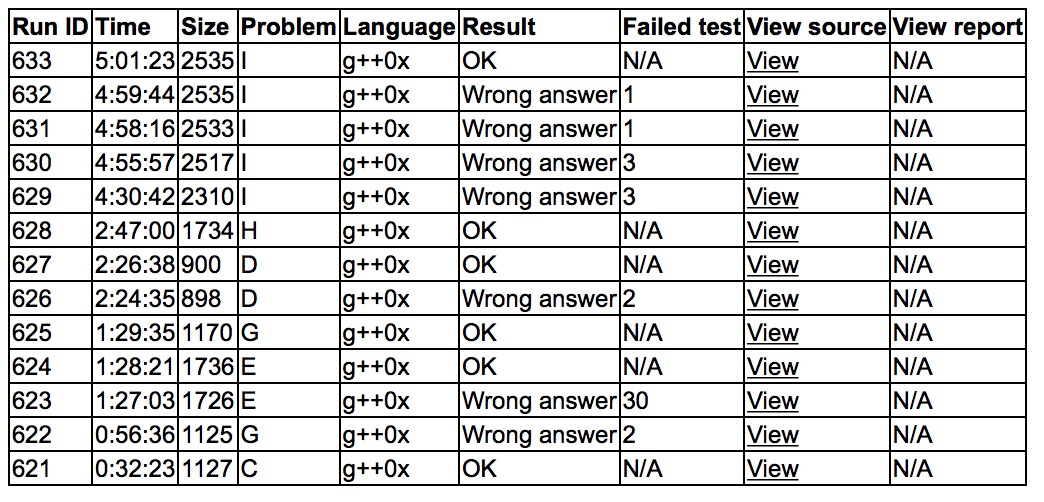sub写C,C1y32。之后yzc写G,sub写E,cjb帮忙写了个线段树,E2y88,G2y89。之后cjb想D,yzc和sub想H,D2y146,H1y167。最后sub刚I,因为eps设大了,赛后1min过掉,没有成功提交最后一发。