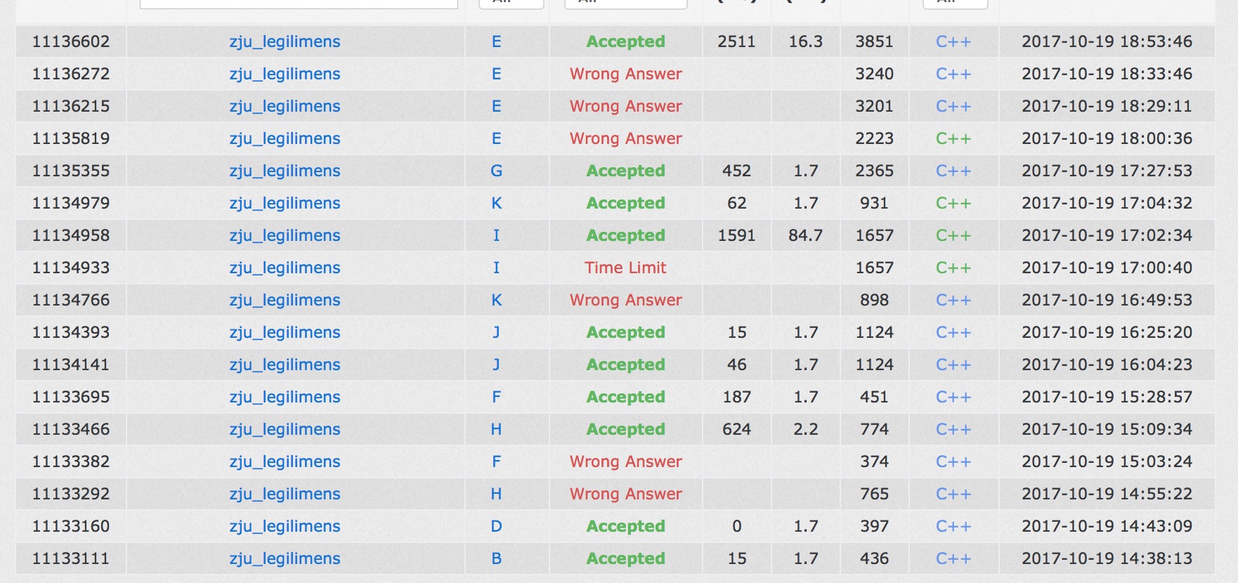 开场各自看题,yzc很快发现B是签到题,上机写B,B1y8. yzc写B的时候发现有人过D,cjb看了下D,yzc写完B后cjb上机写D,D1y13. sub跟cjb讲了下H,cjb就上机写H的kmp了,写完后wa了,cjb打印查错,yzc上机写之前和sub讨论的J,中途被sub换下写F,F也wa了,此时cjb发现了自己H的错误,修改后提交,H2y39. yzc继续写J,sub继续思考F,过了一段时间后sub接过电脑改了一点,提交获得通过,F2y58. yzc继续写J,sub开K,cjb开I,不久后J获得通过,J1y94. 此后cjb发现hdu好像前端炸了,试着又交了一次J,还是能测,十分开心。sub上机写K,调整了许久式子,提交获得wa,cjb和yzc开出了I,cjb本来打算去写可持久化平衡树,yzc及时阻止了并提出了更加简便的可持久化线段树做法,yzc上机写I,sub下机思考,写完后yzc获得tle,检查了下数据范围后改大了数组,再次提交,I2y152. sub也调试出了K,K2y154. cjb上机写此前和sub随意讨论就会做了的G,G写完后直接让yzc去写yzc和sub讨论出的E(cjb:这两个人就用了一首辉夜城的时间就讨论出来了....),cjb肉眼找到G的代码问题,修改后过了样例,提交后 G1y177 . 此后yzc写E,E获得wa后写了对拍,不断调整后还是wa,最后sub提出了一种没有考虑到的情况,最终E4y263. 因为罚时排在了rk2,A和C全场没人做出来,sub尝试做C无果。
