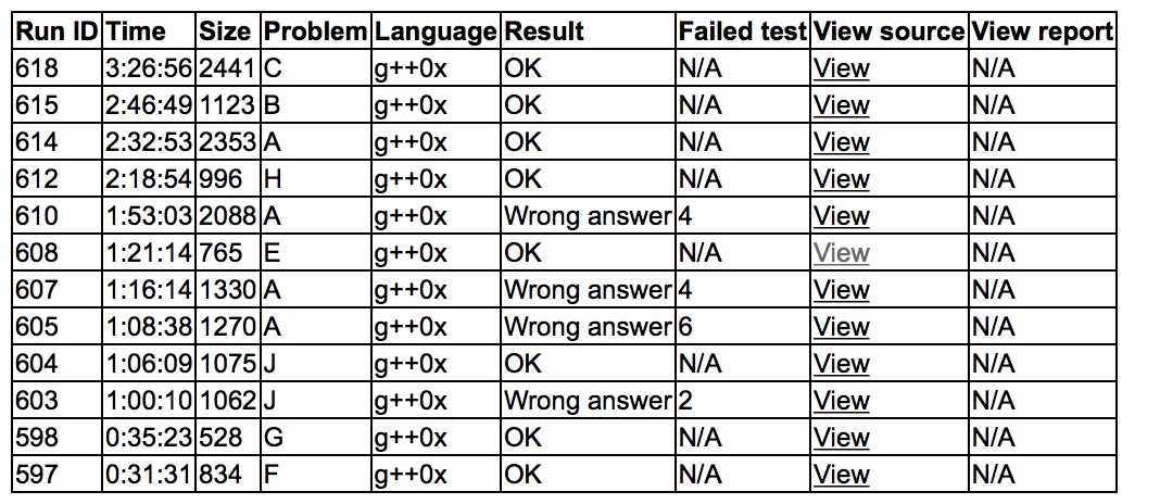 出门各自看题,波兰人英语写得比较诡异,阅读有巨大障碍,cjb上机'''F1y31''',yzc上机'''G1y35''',之后sub上机写J。cjb和yzc开A,之后'''J2y66'''。yzc上机写A,wa了一发后fix了一下还是wa,发现做法有问题。cjb和sub讨论E,上机'''E1y81'''。yzc和sub试图fix A,还是wa,对拍又发现做法还是有问题。cjb开出了H,上机写H,'''H1y138'''。yzc和sub终于fix好了A,'''A4y152'''。发现lyk过了B,cjb和sub开了一下,cjb上机'''B1y166''',sub和yzc讨论C,yzc上机'''C1y206'''。之后yzc和cjb试图开D和K,sub上机试图艹I。D猜测应该不存在无解的情况,但胡乱贪心是不行的。K得到了一个分治+二维线段树,三个log也不能承受,而且很难写。sub的I发现不能贪心,搞不定。