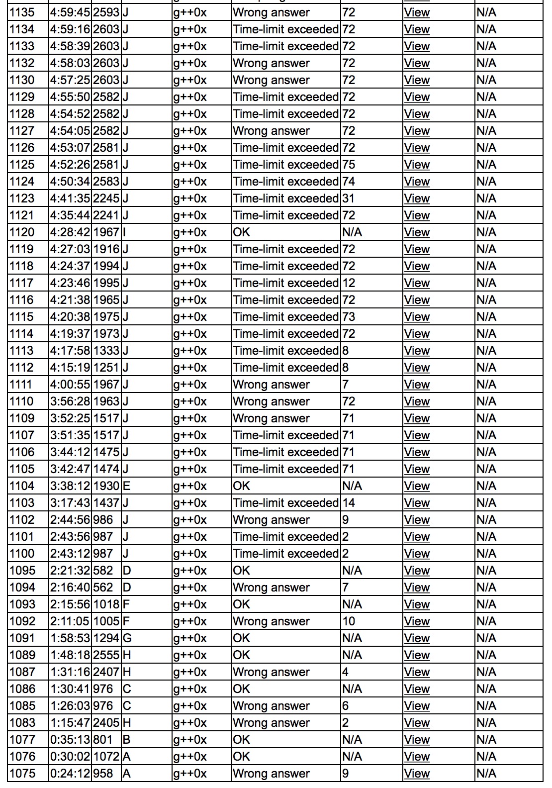 出门各自看题,yzc读了H丢给sub,然后跟榜读A,感觉复杂度有点过好,迟疑了一下'''A2y30'''。sub上机写B和H,'''B1y35''',然后继续写H,wa了。cjb此前开了C丢给yzc,'''C2y90'''。sub继续写H,'''H3y108'''。cjb上机写G,'''G1y118'''。yzc深思熟虑后上机写F,'''F2y135'''。sub开了D,'''D2y141'''。cjb和yzc决定写J的搜索,然后疯狂tle。sub插空过了E,'''E1y218'''。之后cjb和yzc暴搜似乎有了一些进展,tle72。sub抽空写了I,'''I1y268'''。最后一起刚J,tle75还是过不了,AK大失败。