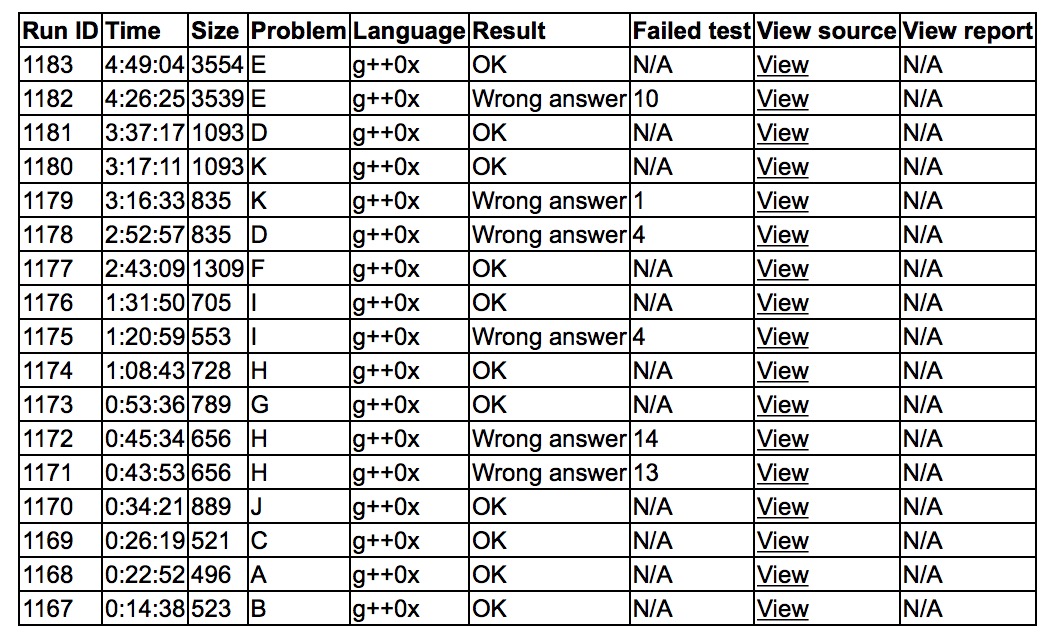 开场各自看题,yzc觉得B是个签到题,但是没读懂题意,就让cjb帮忙读,读完后yzc上机写,cjb发现读错了就小小修改了一下题意,不久后B1y14. cjb之前读了A,sub读了J都很简单,cjb紧接着上机写A,A1y22. yzc读了C,上机C1y26. 紧接着cjb上机J1y34.sub想好了H的做法,上机wa了两发,感觉不对,下机思考。cjb和yzc讨论了一下G,cjb怀疑暴力并不能跑过0.1s的时限,yzc表示很稳并上机把预处理写了,cjb把kmp部分写完后提交获得通过,G1y53.sub想好了如何改H,上机H3y68. yzc此前一直在推I的式子,并上机写了一发,wa了,改成三分后I2y91. cjb上机写F的暴力,跑出了部分解,yzc修改暴力,但是效果不明显,sub给出了一种非常牛逼的暴力方法(让yzc确定lcm后暴力背包求答案),效果拔群,打了个表后获得通过,F1y163. sub上机写D,获得wa,并不知道怎么改,cjb上机写K的暴力,然后质因数分解后看到了规律,cjb交错代码wa了一发后K2y197. sub继续调试D,发现自己凸包写错了,调了一会儿,D2y217. 剩下时间,让深思熟虑的yzc上机写大模拟题E,wa了一发后写对拍调试,最后E2y289,AK了比赛. 最后10min大家一起在找对拍代码的问题。终榜排在rk5,rk6就是UESTC的一队…不过翻到前年集训队的board,比The Last Episode和Aurore的罚时都要差一点,不过比Siunaus要好一点。前几天比较累,所以今天算是放松一下调整状态。