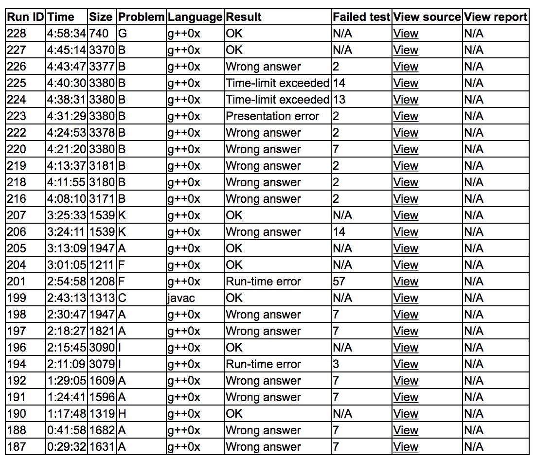 今天这个A主要责任在我这里,下标用反了,然后还用重了。不过总体来说完成度还是不错的,如果一切顺利,应该还有40分钟左右的空闲才对。yzc的I虽然很棒,但是还是有无效时间,还是需要想好先。自己再一次对于能写的题估计悲观,我的H和sub的C都是15min能搞定的题目,与其背着罚时想签A,还是应该更果断地弃掉才对(虽然今天确实弃掉了,比赛都过半了...)。