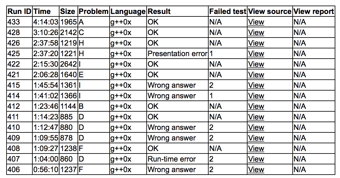 出门各自看题,有人过F之后,cjb和yzc讨论了F,cjb开出来之后丢给了yzc上机,wa了。sub和yzc上机写D,re了。之后F2y69,D4y74。sub上机写B,B1y83。cjb和yzc搞I,wa了,sub上机搞E,E1y126,之后I3y135。sub上机写H,H2y157。C在oeis上找到了,C1y190。最后sub写A,A1y254。