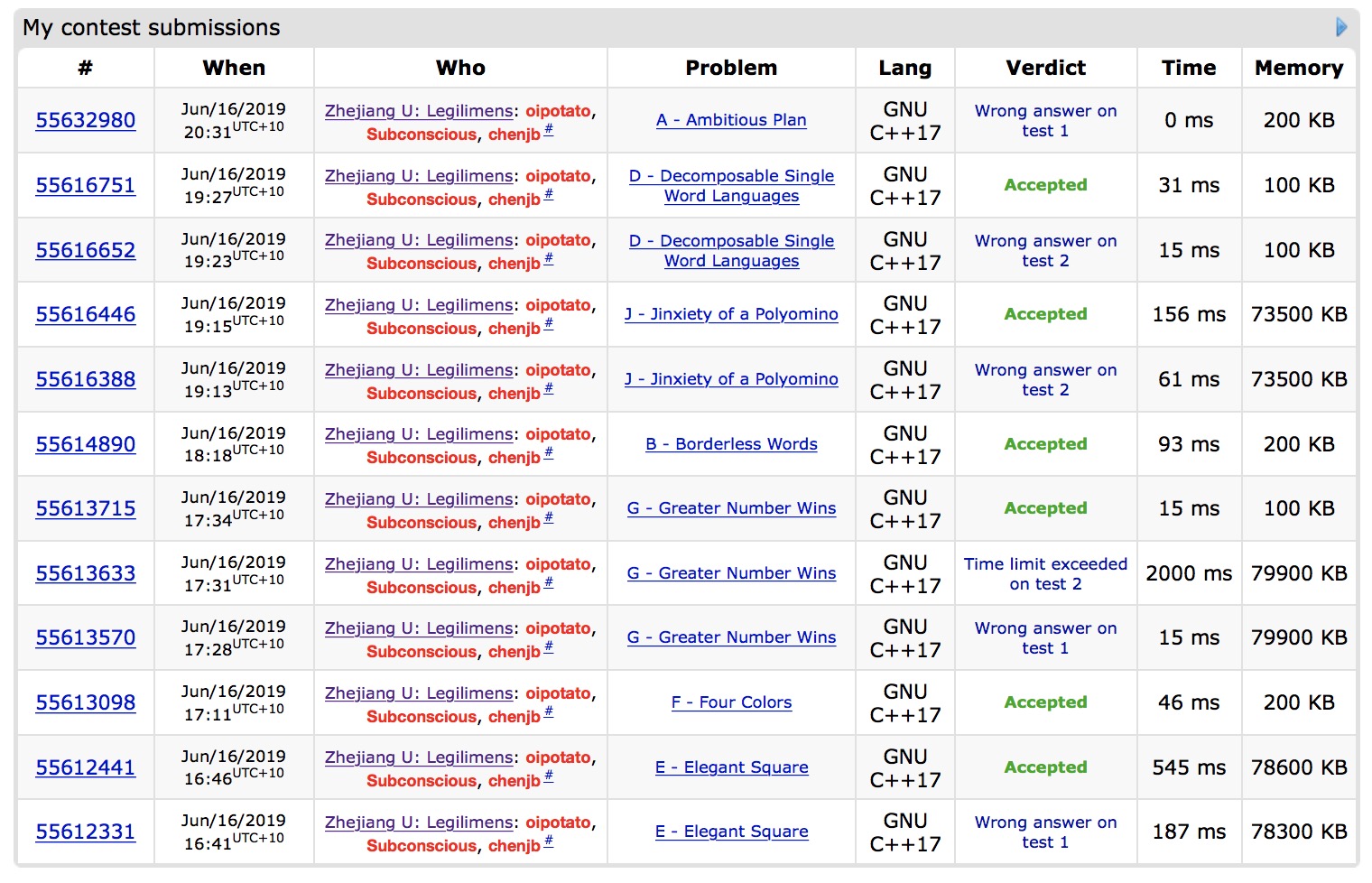 出门各自看题,sub试图做个E,然后失败了,然后他跑路去打计蒜客了,cjb和yzc开始双打。cjb试图艹E,但是本地测试不太行,经过一番努力终于'''E2y74'''。cjb和yzc讨论F,觉得F瞎jb染就行了,'''F1y99'''。之后cjb骗yzc去写G,结果tle了,只好打表'''G3y122'''。cjb想到了B的重要性质,给了大概做法给yzc,结果还是有点细节的,yzc写的很努力,'''B1y166'''。cjb很努力地做J,想到关键性质之后图画错了,又浪费了很久时间,最后'''J2y223'''。sub终于良心发现回来了,和yzc做了个D,'''D2y235'''。