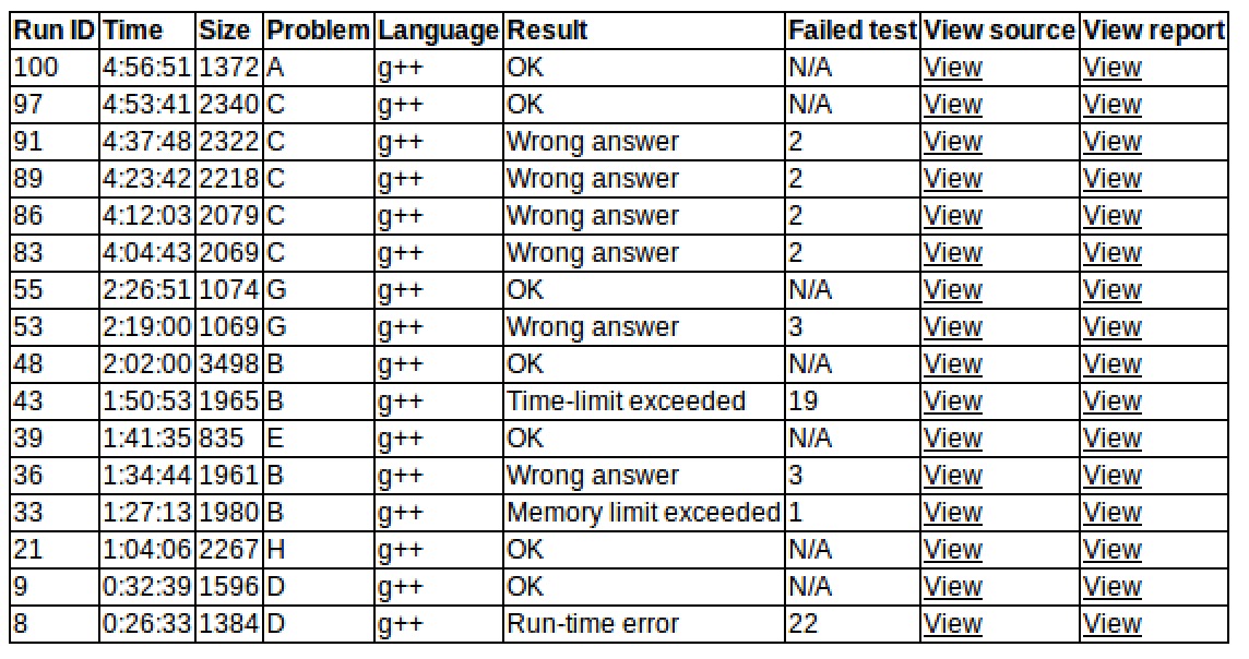 出门各自看题,sub读了D发现可做就上机,cjb和yzc开了H和B,sub '''D2y32''',cjb上机写H,'''H1y64'''。sub给了简单的建图给yzc,还和yzc开出了G。yzc上机写了一会儿G,决定先搞B,让cjb上机抄KM,然后mle和wa了。sub上机先写E,'''E1y101''',查出wa是因为板子从0开始编号,之后变成了tle。不得已换成了费用流,'''B4y122'''。yzc上机继续写G,sub推F,感觉很行,'''G2y146'''。之后sub上机缓慢写F,cjb和yzc研究C,40min后发现F凉了,就让yzc上机写C,C的做法有很多漏洞,在sub的帮助下不停打补丁。发现有队伍过A,cjb和sub搞A,很快发现了性质,进入封榜,yzc交C获得wa,sub帮忙叉了个数据,继续wa,重复了4次这样的过程,cjb和sub加速了A,sub上机rush A,cjb帮忙看,yzc下机静态查。过程中,sub发现代码有漏洞,急忙fix,yzc最后发现自己有个小错误,改了之后'''C5y293''',sub终于过了样例,提交'''A1y296'''。