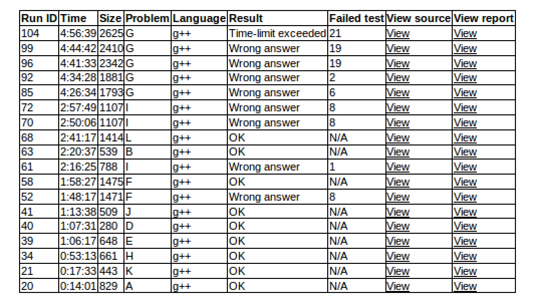 出门顺利地'''A1y14''','''K1y17''','''H1y53''','''E1y66''','''D1y67''','''J1y73''',之后卡了一下sub上机'''F2y118''',cjb搞了个错误题意I wa了,之后fix了之后感觉很稳,sub给出构造,'''B1y140''',sub上机'''L1y161'''。之后yzc上机搞I,wa了之后终于发现结论错了,之后cjb和sub写G没写出来,一直wa就没了。