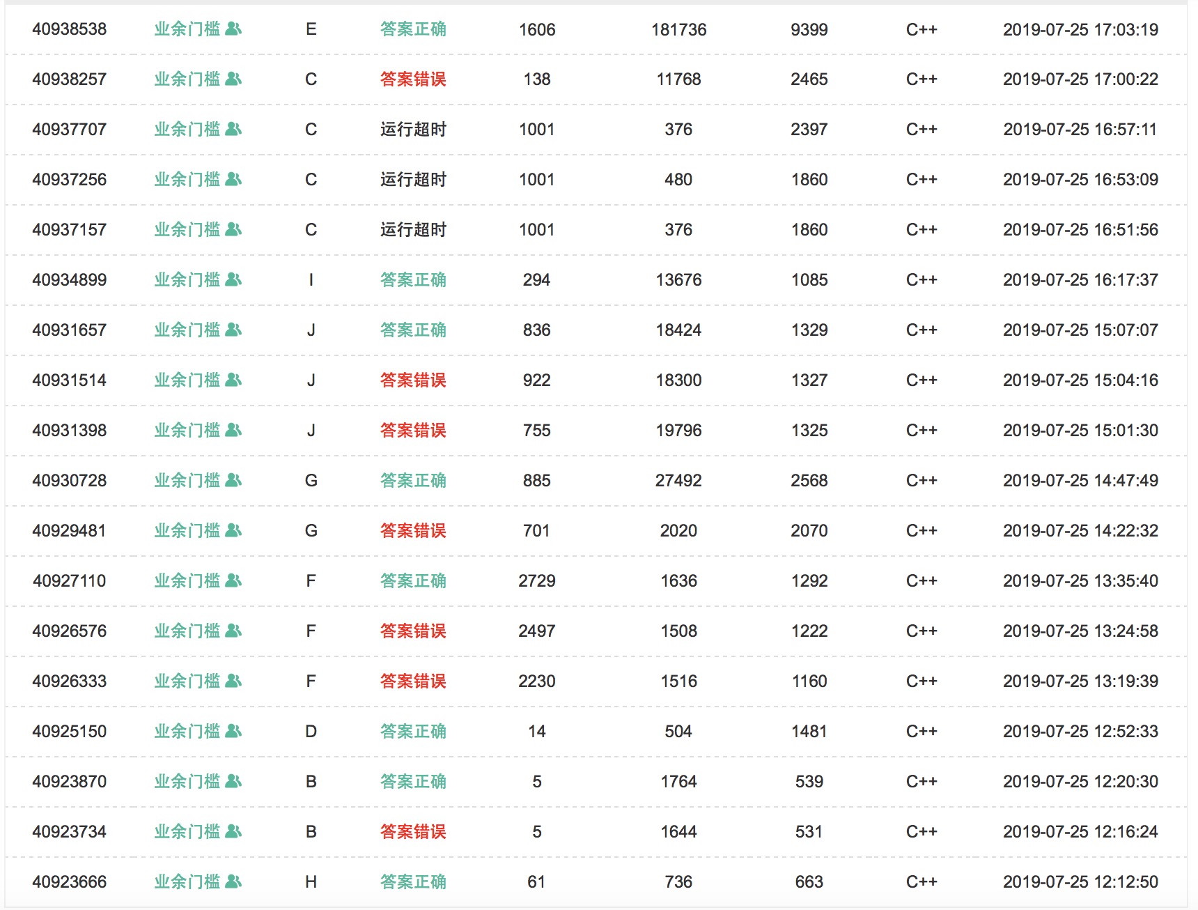 出门各自看题,sub上机写H,H1y12,cjb和yzc开了B,B2y20。之后sub上机写D,D1y52。cjb开出了F丢给yzc,yzc上机wa了之后对拍,F3y95。sub给了G的做法,cjb上机写G,wa了之后对拍,G2y167。yzc上机写J,J3y187。之后yzc和sub想C,cjb想I,苦思了很久,终于得到了I的做法,sub上机I1y257,之后rush C,tle后wa。