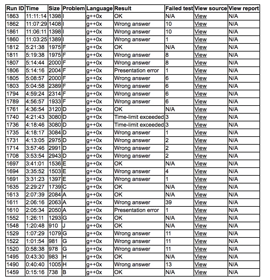出门读了B,yzc飞速上机'''B1y15''',cjb上机写H,'''H2y43'''。之后下机cjb发现大家不是很会做G,就口胡了一波,yzc上机wa了三发。sub上机写J,'''J1y80'''。之后发现了G的corner case,'''G4y86'''。yzc和sub理论A,得到了SAM做法后'''A3y127'''。之后sub上机写C,'''C1y149'''。cjb会了D,丢给yzc。然后先写了个'''E3y221'''。之后yzc写D,wa了几发后,拍出错,发现是误解了cjb的做法,改完变tle,查了半天发现swap了数组。之后sub rush D,赛后获得通过。