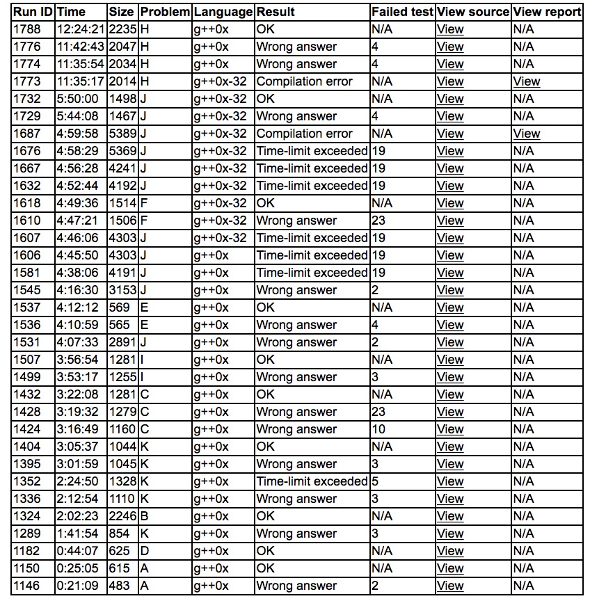 出门搞A,cjb乱搞了一下'''A2y25'''。之后yzc上机'''D1y44'''。中间sub尝试了K wa了,cjb痛苦写B,写了很久'''B1y122'''。cjb下机发现队友对着E和K一筹莫展,就让他们放弃了E,cjb搞K,然后sub和yzc推C那个dp,之后cjb '''K4y185''',yzc '''C3y202'''。cjb读了I,丢给sub准备,然后读了J丢给yzc准备,之后'''I2y236''',J tle后sub上机'''E2y252''',J 继续tle,cjb开出F,'''F2y289''',最后努力爆J失败。