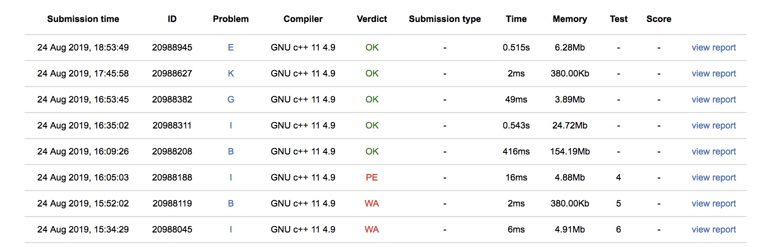 出门做I,感觉做法很假,wa了之后很难受。sub丢了B做法给cjb,cjb上机wa了。I继续改进,变成PE。询问clar问了确定PE是自己程序挂而不是超出询问次数。之后sub发现自己给的做法有个corner case,fix之后B2y99。cjb让yzc造了个大点,发现yzc的cmp函数没return找到问题后I3y125。之后sub做了个G,G1y143。榜上很自闭,sub和yzc决定大力容斥一下K,发现能跑出来,打表K1y195。最后sub和yzc努力搞E,一开始打算线段树高斯消元,后来变成一段精简的代码,E1y243。