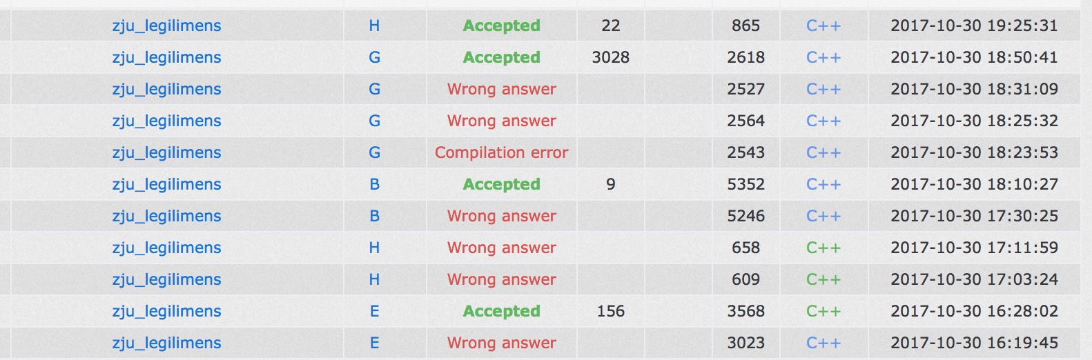 开场各自看题,yzc表达了自己想要写大模拟题B题并且想抛弃另外两人的强烈愿望,被cjb允许了。sub和yzc讨论了G和E,一段时间后cjb上机写E,cjb中途下机调试的时候yzc上机写B,一个多小时候cjb提交第一发,wa了,不久后找到了错误,'''E2y108'''. yzc继续写B,cjb和sub讨论了G和H,都得到了比较靠谱的做法。中途yzc休息的时候sub上机把构造题H写了,获得两发wa。yzc继续写B,最后三个小时作业B wa了第一发。cjb上机敲了G的后缀数组,sub上机把统计答案的部分写了,也wa了。yzc找到了问题修改后过了,'''B2y210''',拿下B的一血,事实上全场也没人做出B。cjb写了对拍,拍出了sub的错,'''G3y250'''. 三个人一起讨论H,cjb上机写暴力,最后'''H3y285'''. 最后rk18,因为G题在现场改了数据范围,但是今天做的时候没有改,所以board没有太大参考价值,但是今天三个人都挺开心,这样也算是一边体验一边小心地放松一下。