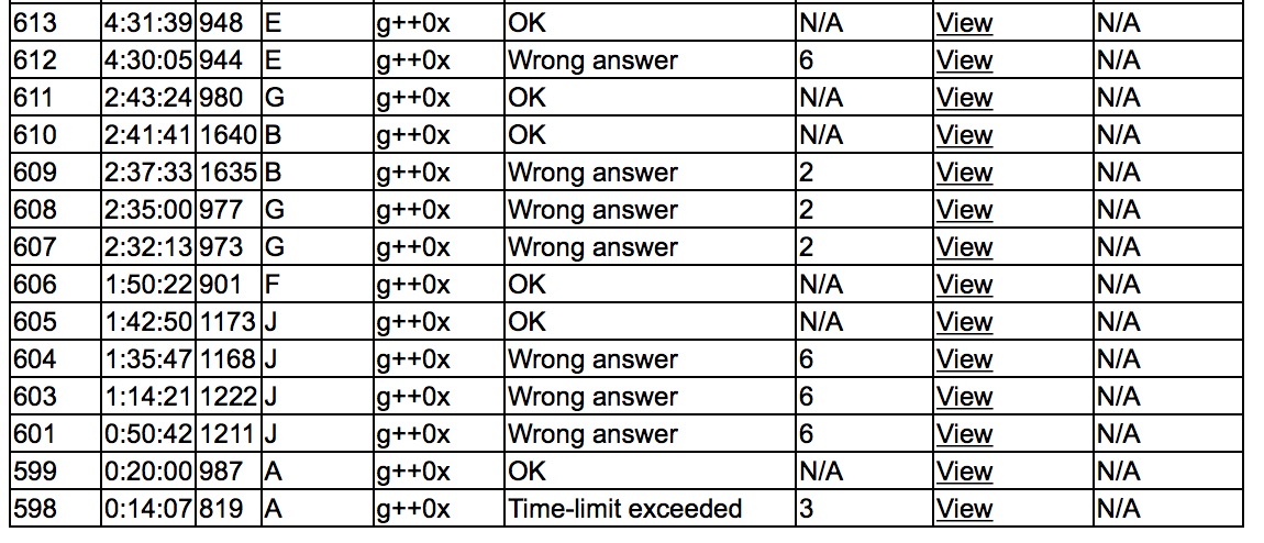 开场各自看题,cjb不紧不慢地打好了头文件,yzc觉得A是个签到题,比较诡异,上机写了A,tle了一发,yzc改了改,A2y20. sub给cjb讲了J,两人很快得到了做法,cjb上机写J,途中和sub讨论了一次,通过样例后wa了. wa了之后很诡异,找不到错误,以为是一些奇怪的编译器问题,改了还是wa,写了对拍拍不出错,最后发现cjb用了char来存字符串长度....J4y102. yzc此前已经和sub讨论好了F,cjb下机的时候也写了一点,J过后迅速上机很快写完,F1y110. 接下来时间,cjb一人开G,sub和yzc一起做B。cjb得到了正确的结论,写了代码获得两发wa,yzc和sub终于调好了B,wa了一发后B2y161. cjb找到了G的bug,G3y163. 接下来三个人一起讨论E,讨论了一段时间后yzc终于得到了大概的做法,yzc上机写E,cjb和sub研究I,E细节很多,yzc调了很久,最终E2y271. sub上机写I没有写完,6题收尾,一队此前训的时候7题。