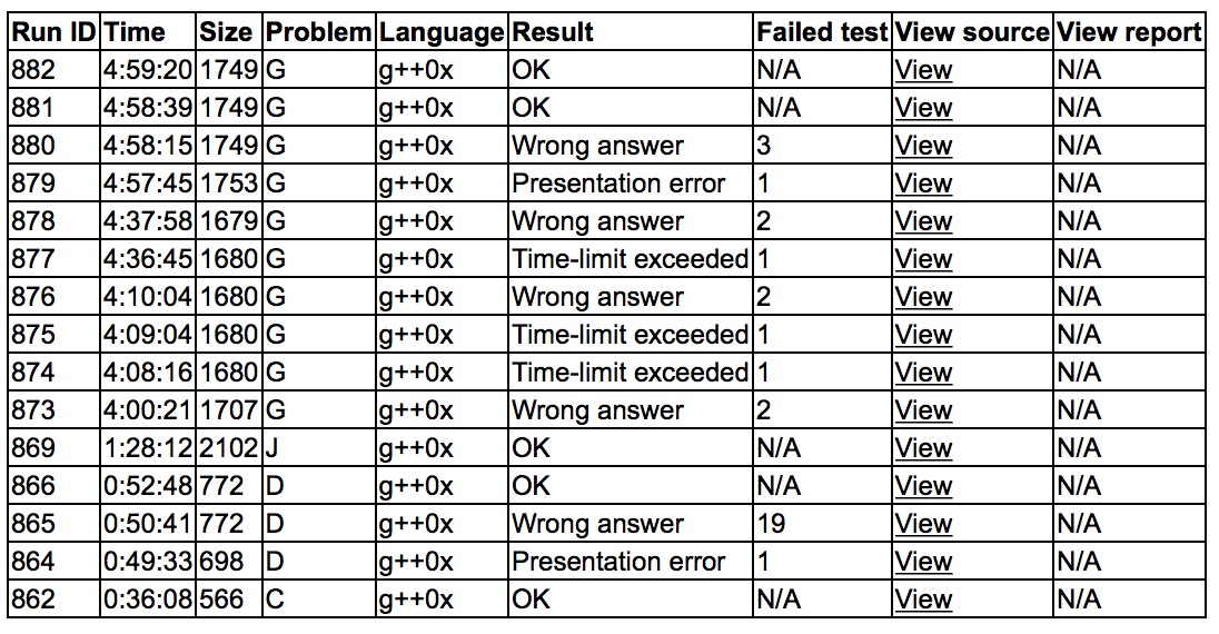 开场各自看题,一段时间后cjb上机试图写A的java,写到后来不知道怎么搞,遂放弃。yzc和sub讨论了已经有人过的C,yzc上机,C1y36. cjb和sub讨论了一下D,yzc写完C后就让他继续写D,D3y52. cjb和yzc传达J题意的时候发现自己理解的题意有点偏差,思考一会儿后就想到了费用流,cjb上机敲了板子,yzc让cjb去想G,自己来写建图,不久后J1y88. 接下来的时间,sub尝试做A或G,yzc和cjb尝试做E,一直都不能做。三个小时的时候cjb终于想到了大概的G的思路,和sub讨论,yzc也加入讨论,但是三个人都没想清楚,cjb打算先去写个暴力,尝试优化之后调参。后来yzc和sub加入战斗,找到了很多bug,也进行了很多尝试,但是一直wa,最后无奈之下和暴力对拍找到了一个非常隐蔽的错误,最后终于G9y298. 一队做了5题,我们只做了4题收尾,不太理想,需要继续努力