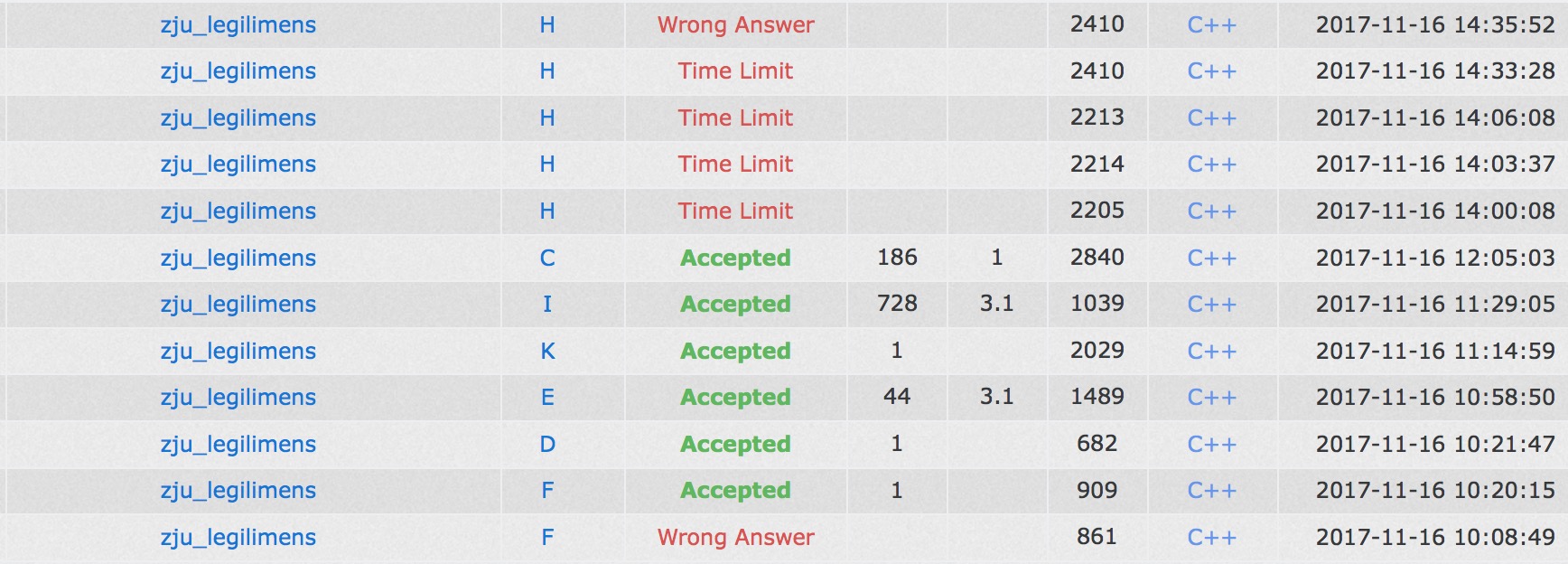 开场各自看题,很快发现F可做,yzc上机写F,wa了一发,懵逼了,耽误了很久终于发现了一个阅读细节,F2y13. cjb读了D,也是签到题,把题意告诉了yzc,yzc上机D1y21. 接下来陷入了短暂的卡题,cjb和yzc很快就发现E很可做,讨论了一下yzc上机写E,写完发现过不了样例,原来cjb读错题了,不过还是很简单,yzc改了会代码E1y58. sub想好了K和I,上机打了个表后证明了K的结论,就让cjb接手来写主代码,cjb一开始打算写java,写了写感觉不对,就改回cpp,不久K1y74. sub上机写想好的I,I1y89. cjb很早就想好了C的上下界费用流,写了一会儿,给yzc讲了讲代码找到了小bug,最后C1y125. 接下来的时间,cjb和yzc尝试做B,sub上机写慢慢有很多人过的H,但是因为不熟悉K圆并这个模型,用simpson之后就tle,最后也没有调出来。cjb和yzc在接近四个小时的时候才想到了B的比较科学的做法,但是也没来得及实现。最后6题第一,金牌垫底,早早做出6题但是没能有哪怕一题的突破是比较可惜的,现场Siunaus做出了几何题最后7题。