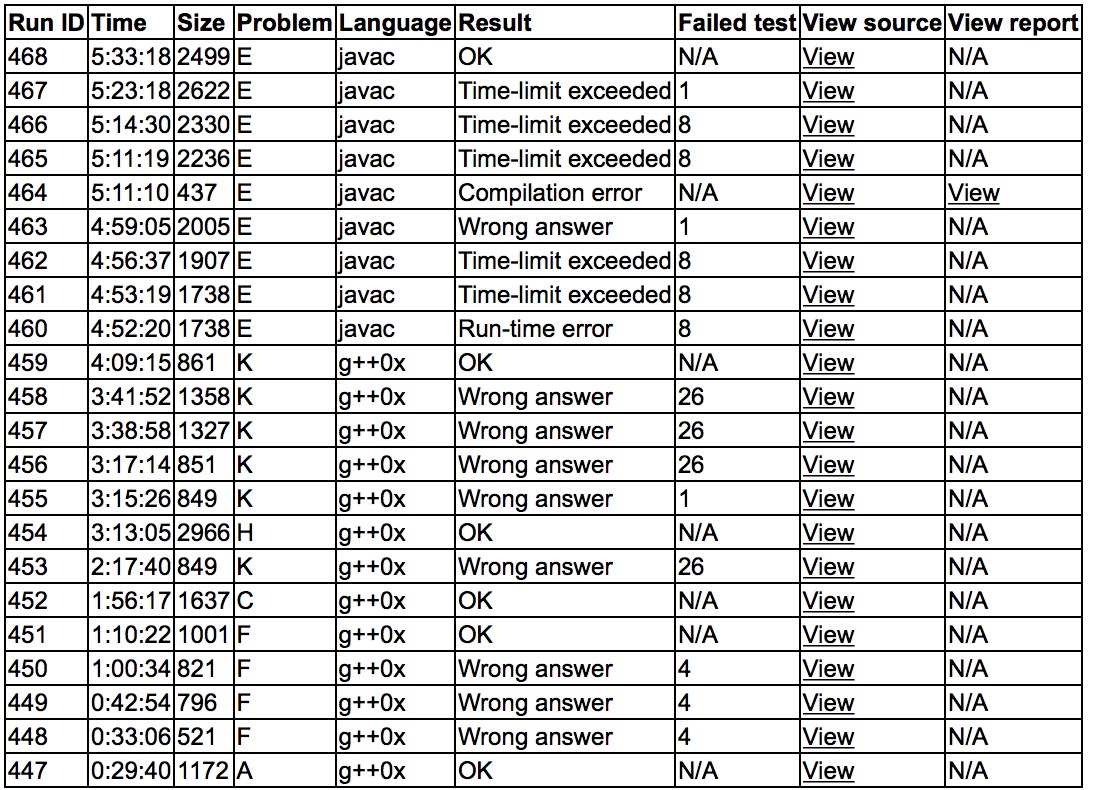 开场各自看题,cjb读了A,感觉是个模拟题,先跳过看B,和yzc讨论了下B,感觉不太行,看board发现很多人过A了,于是让yzc上机写A,A1y29. cjb上机写也很多人过的F,wa了3发,感觉算法不对,和sub讨论了之后,sub上机改了改,F4y70. yzc上机写C,sub和cjb开了K、H。yzc写C花了点时间,最后C1y116. cjb上机写K,又wa了。挣扎了一下,决定让yzc上机写H,H写了接近一个小时,最后H1y193. 接下来大家一起搞K,又wa了4发,最后暴力跑出了几个原本贪心怎么fix也过不了的数据,只好放弃原来的做法。cjb提出了按3分组的一些性质,yzc获得灵感,上机重写K,K6y249. 接下来大家一起看E和J,最后决定开E,手算出变化,写了暴力,最后决定让cjb上机写java。cjb写完后RE 8,迅速改了循环数组则TLE 8,时间不多了也就没有过去。结束后三个人继续优化代码,加了一个剪枝后通过了E。