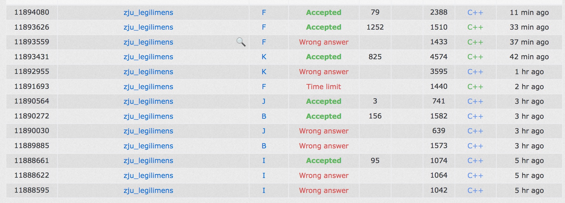 开场各自看题,cjb认为I是签到题,和yzc讨论了起来,yzc上机写,犯了两个2b错误,'''I3y31'''。接下来不太会做题,三个人讨论了I,cjb决定先写K,写了写K,yzc想好了B,于是让yzc先上机写B,sub想好了J,yzc wa了一发后让sub上机写J,也获得wa。cjb继续写K,yzc找到B的错误,'''B2y121'''。sub也找到了J的错误,'''J2y134'''。yzc和sub讨论好了F,上机获得tle,在机上磨蹭了一段时间。cjb继续写K,yzc帮忙看着,sub想F。wa了一发F后,yzc帮忙写对拍,改了一些错误,终于'''K2y266'''。sub想到了K的naive做法,改了之后获得wa,研究了一下终于'''F3y275'''。最后尝试做A,时间不多没有成功。