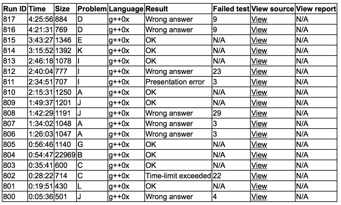 开场各自看题,sub认为J是签到题,给yzc讲了结论,wa。发现有人过了L,询问了sub L的题意,写了折半搜索后突然意识到不需要,修改后L1y19. 紧接着写C的爆搜,写了之后发现会tle,加了剪枝提交还是tle,突然意识到不需要,修改后C2y35.cjb把B和G都告诉了yzc,决定先跑着B的暴力打表,同时写G,跑了一会儿后B跑完了,最后B1y54,G1y56. 接着sub上机写A,wa了两发,下机思考,此前yzc从sub那获得了J的大概做法,yzc上机写J,wa了一发后cjb找到了特判,J2y109. sub也找到了A的问题,加了特判后A3y135. 三人讨论了一下I,yzc上机写I,PE后WA,cjb手写了qsort后I3y166. yzc和cjb开出了K,之后K1y195. sub上机写深思熟虑的E,E1y223. 最后三个人集智想D,尝试交了两发,没有获得通过。