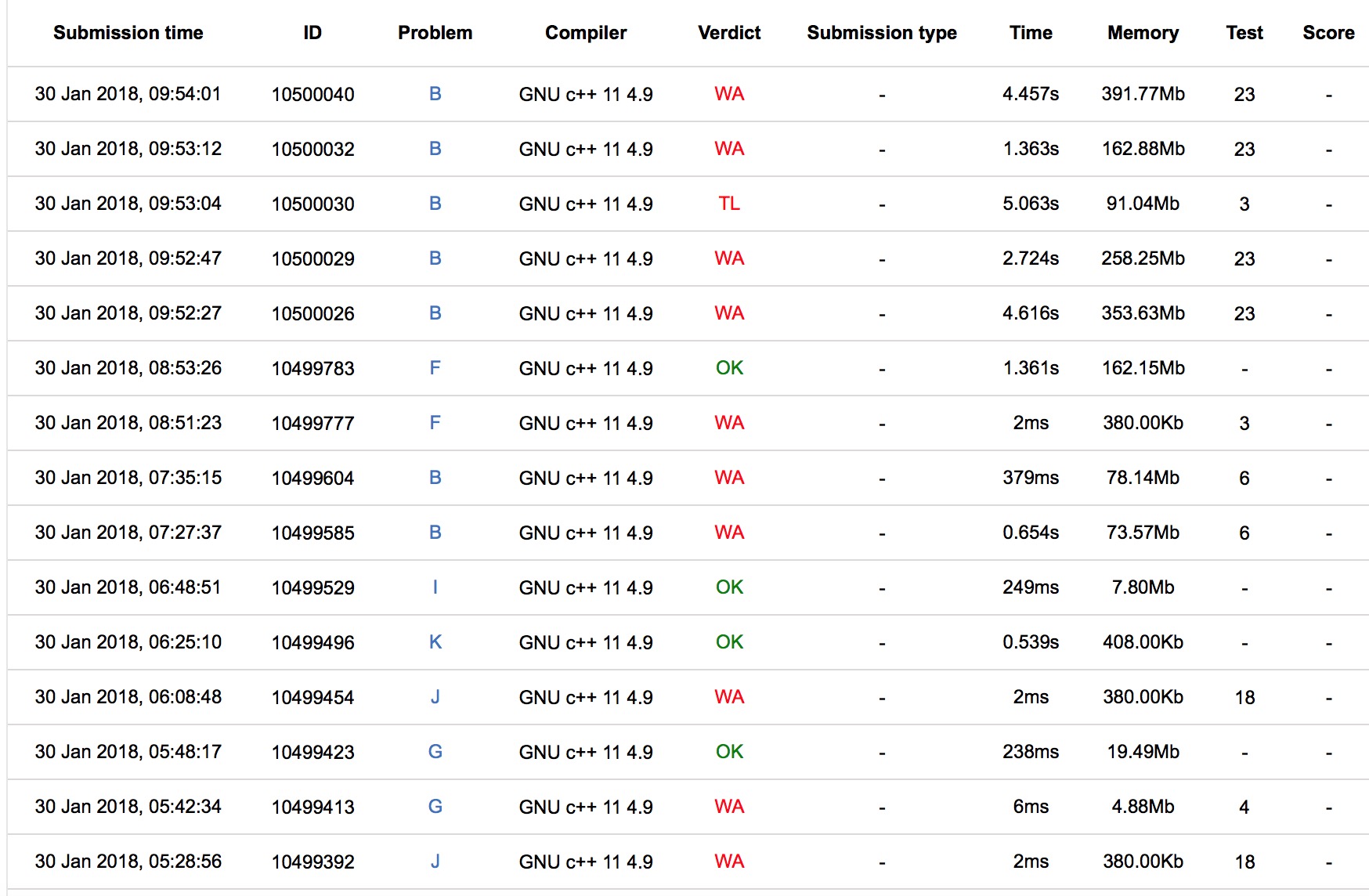 从题数上看,5-6题才算比较满意,和Nightfall以及Wood Cube保持在一个梯度,但是要追赶他们的还有很多,应该拿Nightfall和Wood Cube作为第一个努力的目标。自己感觉整场比赛脑子动得比较多,但是几道图论题最后都没能做出来,B花费了很多时间,用了很多做法,但是比起以前做ASC, sub没有以前那么辛苦,我和yzc都能够在思维上提出东西,这也是一个进步,要继续保持。比赛节奏上,因为大家都做得比较慢,感觉前期要注意读题,比赛中有好几次看到有人过了才去了解题意(这也有我的锅,没读懂...),另外就是要好好补题啊,感觉这些题确实是能提高我们的水平的。
