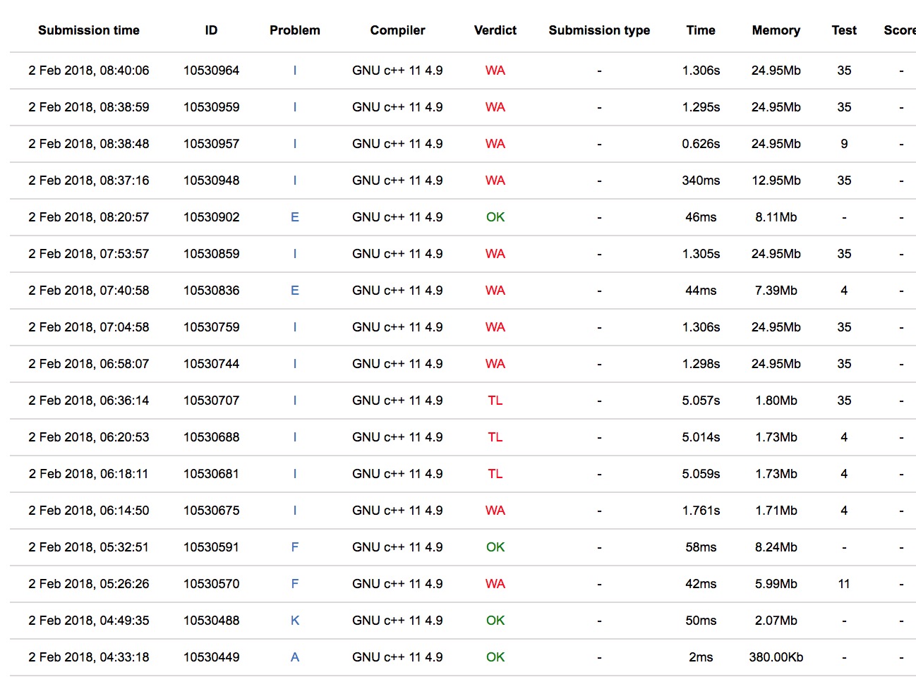 不应该让I耽误做法比较确定的E太多时间,保有太大的侥幸心理想卡I,浪费了许多时间,算是个以后要注意的细节。但是I不会做也真的是因为我们套路见得太少了....可能zju的队都有这个问题.....好好补题多总结,技不如人就只能多练多学了。和woodcube学长交流了之后,另一个总结的地方就是弃题弃得很不干净,这样还不如不弃....要习惯这种感觉。