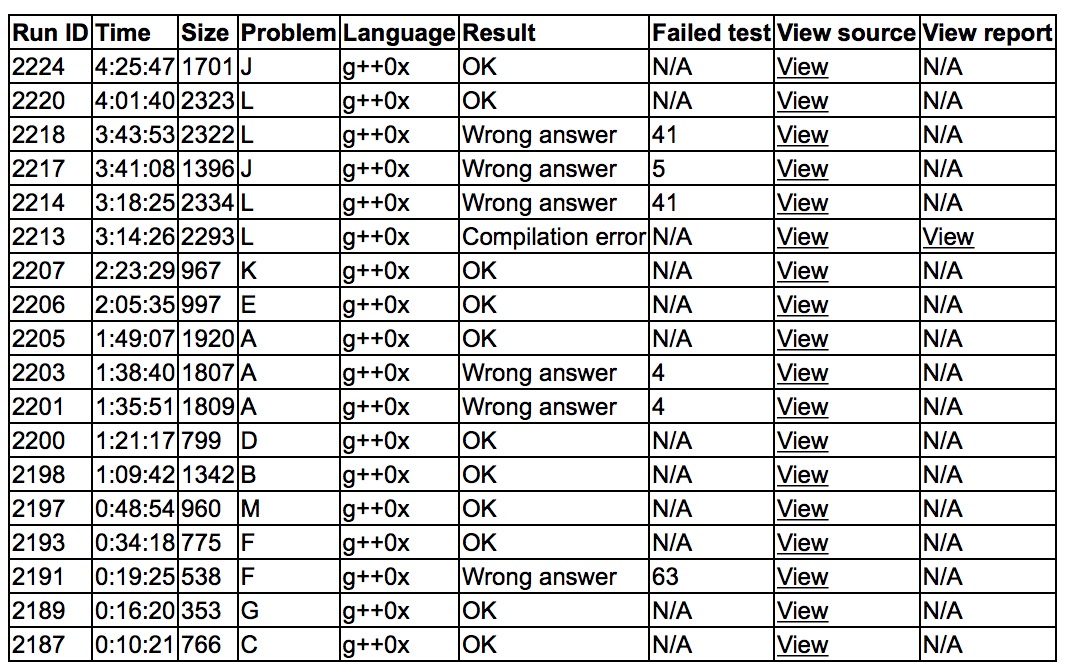 开场各自看题,yzc读到了签到题,丢给cjb,cjb上机C1y10。yzc和sub讨论了F,yzc上机写F,写了一会儿下机思考,cjb上机写G,G1y16。yzc继续上机写F,wa了,和sub讨论了一下,修改了算法,F2y32。sub上机写B,cjb和yzc讨论了M,yzc给出了更加清真的做法,把sub换下来上机M1y48,sub继续写B,之后B1y69。sub读了读D,把题意丢给了cjb,cjb和yzc讲了讲,讨论了一下,之后D1y81。之后cjb和yzc讲了A的做法,上机交替写代码,犯了点小错误,A3y109。sub丢了个dp给yzc,yzc上机E1y125,cjb和sub讨论了之后又丢了个dp给yzc,yzc继续K1y143。之后sub上机写L,cjb和yzc研究J,sub写了一段时间,wa了,yzc上机写J,也获得wa。sub上机改了还是wa,cjb上机写J的对拍,之后sub找到了错误,L3y223。yzc上机调试J,最后J2y265,最后3人一起开H,没搞出来。