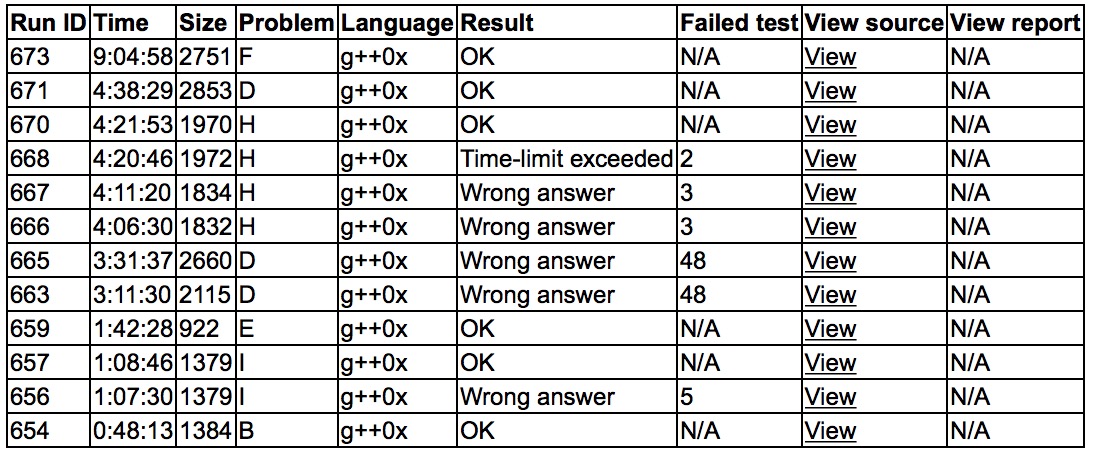 开场各自看题,看到有人过了B,cjb读了B,上机开始写,写完发现题意不太对,和yzc讨论了下,yzc给了个线段树的做法,cjb上机继续写,之后'''B1y48'''。sub和yzc讨论了I,yzc上机写I,'''I2y68'''。sub给出了E的算法,yzc表示怀疑,上机写了,之后'''E1y102'''。之后集中攻D,yzc上机写了暴力找规律,各种分析推广后终于在3个小时的时候wa了第一发,cjb发现一队过了H,读了H,和sub讨论了之后会做了,之后D一直在调试,三个半小时wa了第二发,cjb上机写H,之后'''H4y261''',最后终于找到了D的问题,'''D3y278'''。