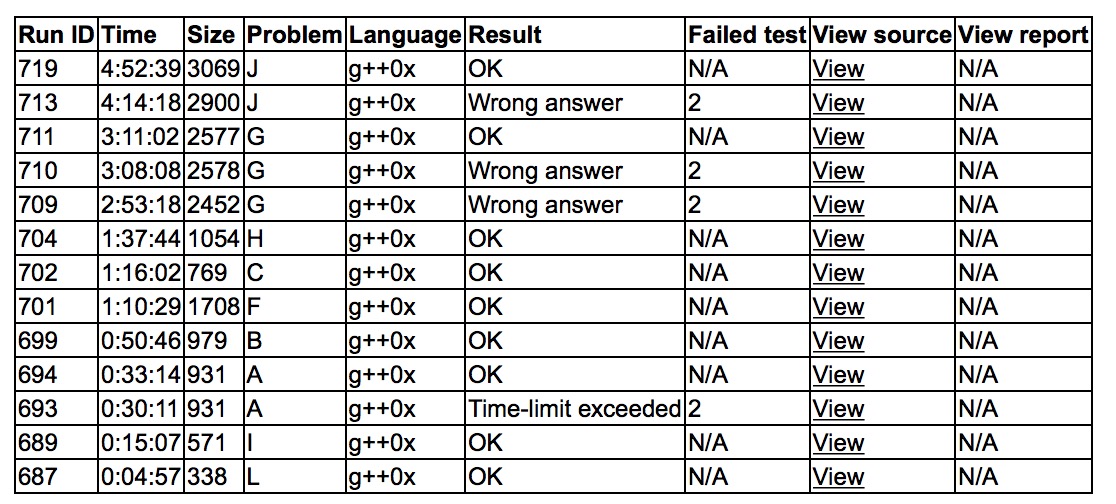 开场各自看题,sub读了L,让yzc秒了L,L1y4。发现有人过I,cjb把I秒了丢给yzc,I1y15。cjb读了A,也秒了A,跟sub讲了讲,sub推了一会儿,the一发后调整了一下二分,A2y33。cjb和yzc研究B,cjb丢了个dp,yzc上机B1y50。cjb读了F,发现是费马点模板题,随后找到了板子,sub看了看发现可行,之后cjb上机敲,调整了下参数后F1y70。此前cjb读了C,感觉是个简单构造题,丢给sub,sub之后C1y76。sub和yzc开出了H,yzc上机H1y97。sub独自思考G,cjb和yzc讨论J,之后sub上机写G,之后wa了,调整了之后终于G3y191。cjb和yzc讨论J到了很深一步了,sub加入讨论后给出了最后一击,cjb上机写预处理,yzc上机写work,之后wa了。cjb上机写了暴力,yzc对拍之后发现去重有些问题,修改之后终于J2y292。