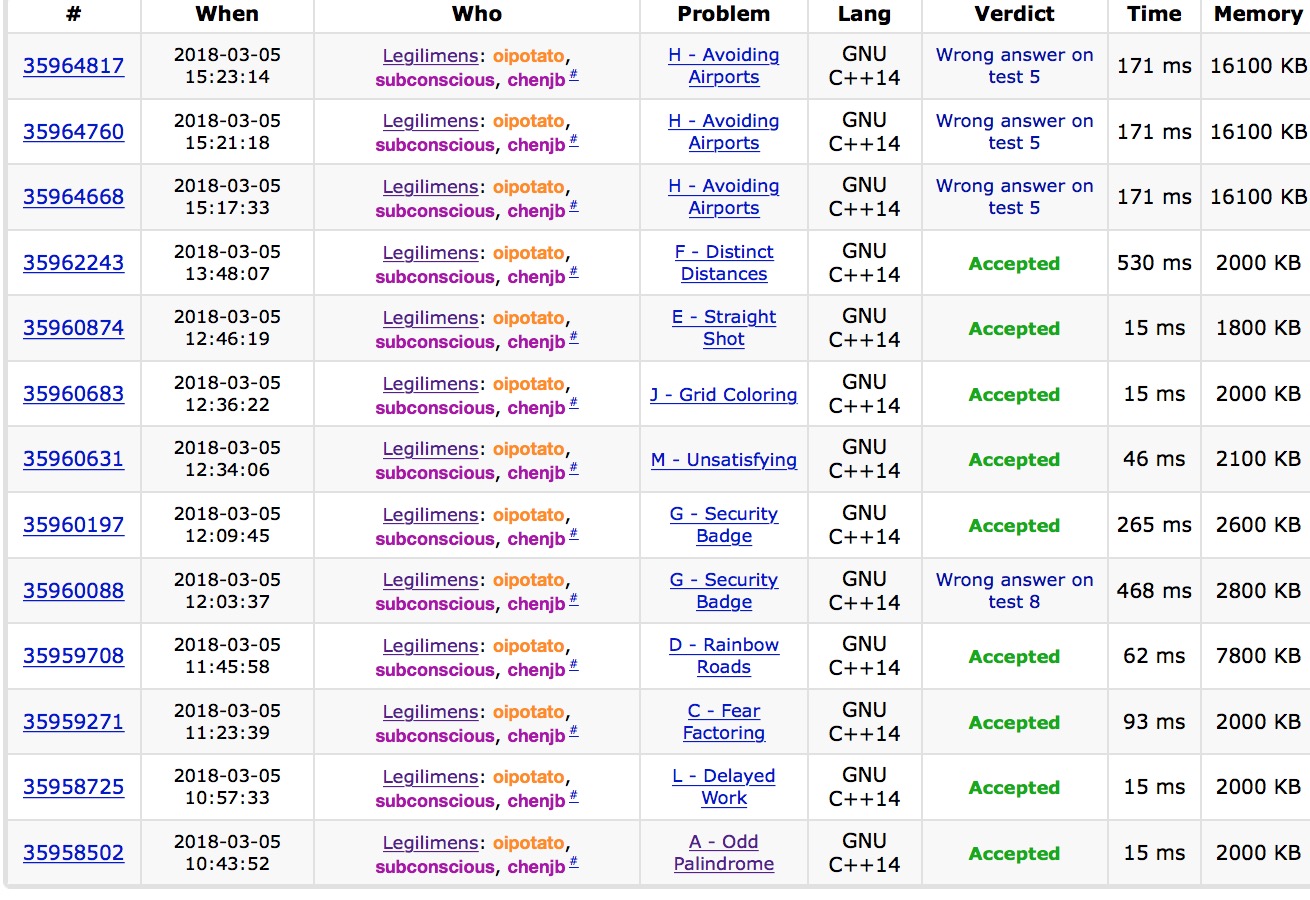 sub跑路了,cjb和yzc双打,依次纷纷地过了A、L、C、D、G、M、J、E,讨论了一波F,做法发生了偏差,花了点时间F才过,最后sub帮了点忙,但是H因为sb的inf设错了赛后才过,萌萌哒~