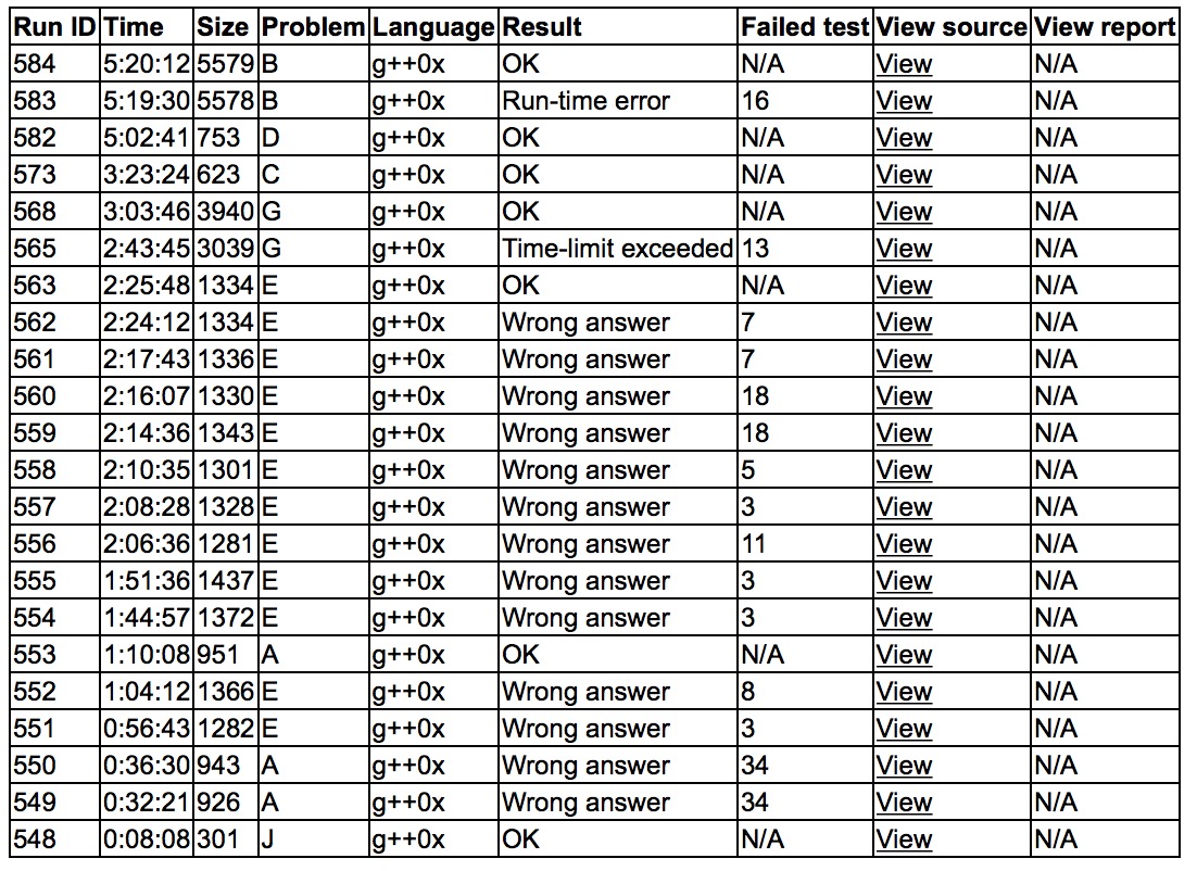 开场各自看题,不久有人过J,sub读了J丢给cjb,cjb上机'''J1y8'''。cjb读了G就判断是个网络流,先行敲了dinic板子。渐渐有人过了A,sub和yzc经过了谨慎地讨论,yzc上机写A,wa了两发,打印检查。cjb和sub判断E是个cls的old题,cjb上机很快敲完,也wa了,调了精度wa在了后面的点,很难受。sub和yzc终于找到了A的问题,yzc上机终于'''A3y70'''。cjb在接下来的时间里修改了无数次的E,wa在各种各样的地方,其中cjb也和yzc讲解了树套树优化网络流的方法,yzc抽空上机写完了,sub独力开C,多次上机都告失败。最后cjb改了匪夷所思的地方后终于'''E12y145'''。yzc上机很快写完了G,提交获得tle。cjb表示可能要用二维st表代替树套树,给yzc讲解完后yzc上机'''G2y183'''。sub终于得到了C的做法,之后'''C1y203'''。之后三个人试图讨论D,没有得到很优美的做法,sub表示B是个三维凸包+最小圆覆盖的板子题,cjb上机开始敲,敲了20多min还让yzc查了很久bug,最后20min sub rush B没有成功,赛后20min通过了B,敲板子的时候sub给yzc理论了D,但是做法比较不清真,思路不清晰,没能达成输出。