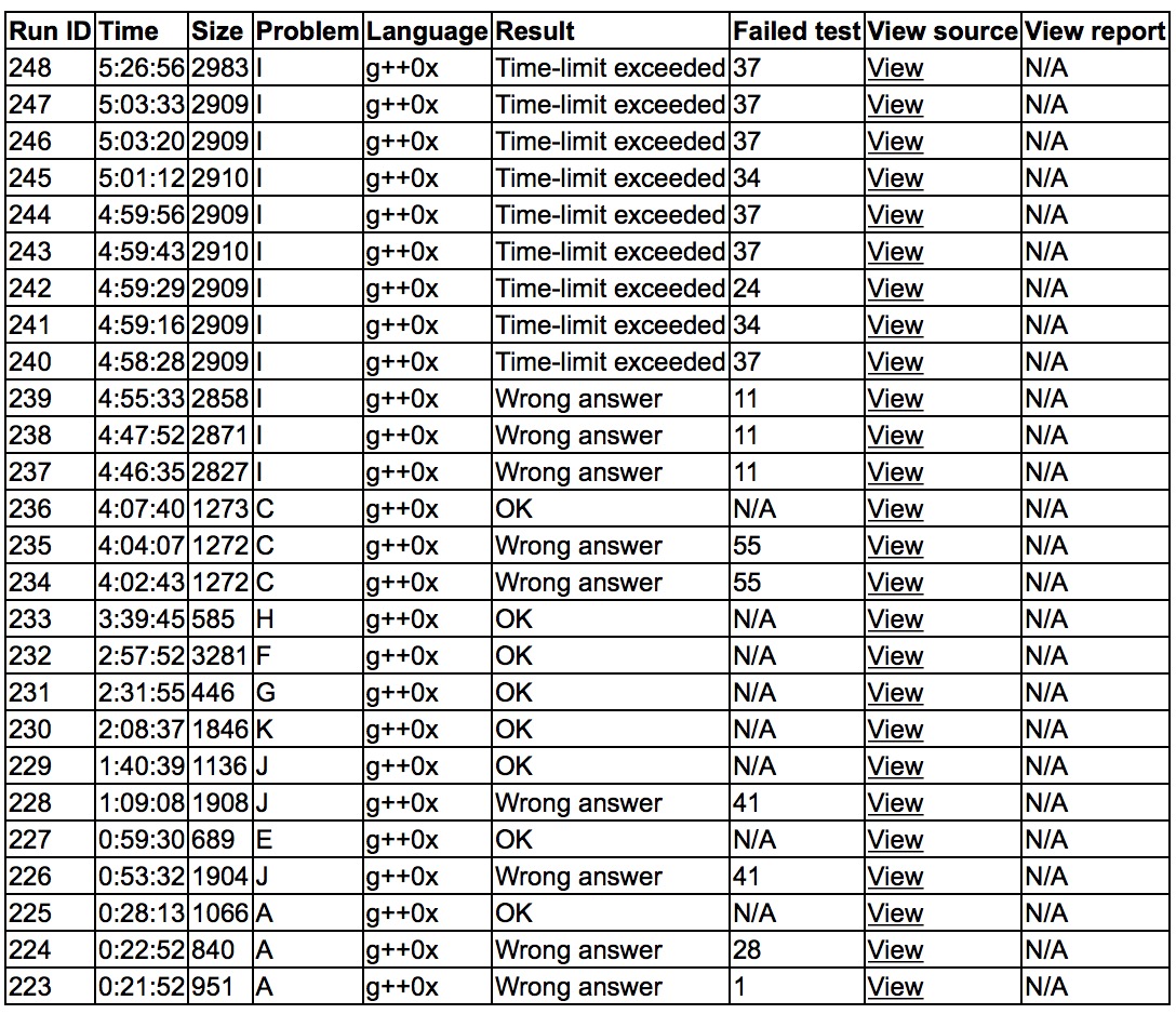 开场各自看题,不久后有人过A,sub让cjb敲了个高斯消元,然后上机写A,提交错误wa了一发,之后wa在28,sub修改了精度之后A3y28。cjb和yzc开出了J,yzc上机写J获得wa,感觉很奇怪,一直找不到错。sub想好了E,上机E1y59。cjb开出了K,向sub确认做法后上机写K,yzc又wa了一发,在大家建议下决定想清楚后重写,之后终于J3y100。cjb继续写K,通过了yzc构造的数据后K1y128。sub研究G,cjb和yzc看F,迅速判断是树上莫队,cjb上机敲板子,敲完后yzc对板子,sub想好了G的构造,上机G1y151。cjb提出了更优秀的莫队做法,yzc上机F1y177。sub推了H的式子,上机写H,但是精度不太行,三个人研究了一下,sub给出了比较科学的写法,H1y219。之后sub上机写C,wa了两发后C3y247。此前cjb和sub给出了I的一个根号做法,之后又和yzc商量过,最后yzc上机写I,sub辅助,最后交了很多发,调了各种参数还是tle,最后8题收尾。