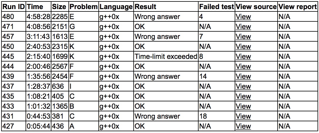 开场各自看题,yzc上机'''A1y5'''。yzc继续上机写C获得wa,cjb开了F和K,上机写了一部分,sub上机写B,'''B1y61'''。yzc和sub讨论了下C,换下写F的cjb,'''C1y68'''。sub读了I,发现很傻逼,上机'''I1y88'''。cjb写完F,wa了,帮sub上机写了K的一小部分,sub完成剩下的部分,cjb给yzc讲了讲F,发现了一个bug,改了之后'''F2y120'''。sub发现cjb的小部分写错了,yzc上机重写,之后tle了,三个人发现算法有点问题,修正了之后终于'''K2y160'''。yzc开了E,上机写了E,wa了。sub上机写G,cjb开J,提出了大概的做法,和yzc理论了很久E都找不到错,sub终于搞定了G,'''G1y248'''。最后yzc一直在调E,写了对拍但是一直拍不对,无功而返,7题收尾打出GG。
