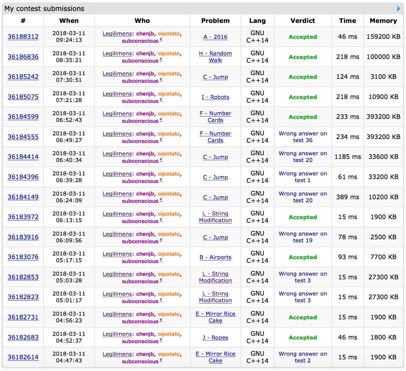 开场各自看题,发现有人过E,yzc丢了个做法给cjb,获得认同,cjb上机获得wa。sub读了J,丢了个式子给yzc,yzc上机'''J1y17'''。yzc感觉做法是错的,然后改了改,'''E1y21'''。sub给cjb讲了L的做法,cjb上机wa了两发,sub给yzc丢了B的做法,yzc上机'''B1y42'''。cjb想了一个C的性质,sub丢了个做法给yzc,yzc上机wa了。接下来各自陷入了思考,cjb做L,yzc搞C,sub搞F。cjb终于想到了做法,上机'''L3y98''',yzc和cjb感觉开大数组就能过C了,又交了几发,还是wa。sub上机写F,wa了一发后找到了问题,'''F2y137'''。cjb发现一队过了I,读了读发现是sb题,让yzc上机,'''I1y166'''。cjb提出了C比较合理的bfs,yzc改了之后终于'''C5y175'''。接下来三个人合力搞A、D、H,cjb提出了一个式子,sub表示自己能够容斥,'''H1y240'''。最后三个人乱搞,cjb负责瞎逼逼,怂恿瞎交,结果'''A1y289'''。