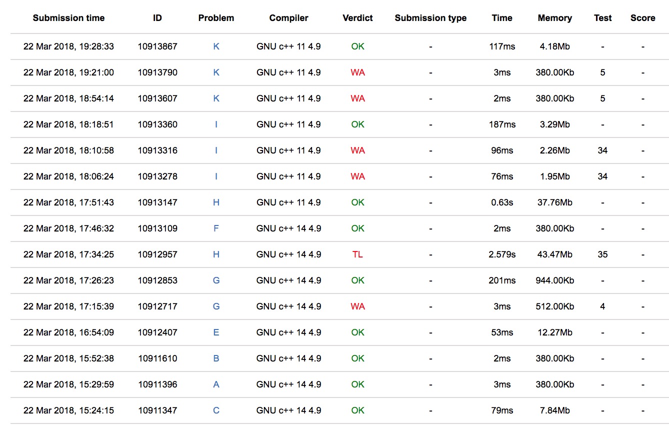 开场各自看题,感觉C能秒,讨论了一下,sub上机C1y19。yzc读了A,很sb,之后上机A1y24。发现有人过B,读了之后简单讨论了一下,yzc上机B1y47。之后感觉E是个点分治模板,cjb上机写了绝大部分,yzc把twopoint写完后发现样例不对,再读cjb发现题意错了,sub上机写G。之后yzc想好了E的树型dp,上机E1y109。此前cjb让yzc抄了H的ac自动机板子,Gwa了一发,之后cjb上机写完了H,sub再次提交G2y141。cjb调过样例获得tle,yzc上机写构造题F,F1y161。cjb决定卡一下常数,H2y166。之后sub让yzc上机写好了I的判无解,之后sub和cjb讨论了I的二分求答案,yzc上机wa,调大范围还是wa,最后决定把二分范围开到long long,I3y193。sub读了K,想了个正确性存疑的贪心丢给yzc,决定上机刚M,之后发现失败。yzc想好了线段树要维护的东西,上机wa了,之后感觉贪心有问题,叉了很久,发现之前代码有个地方写错了,改了之后又交了还是wa,之后把一个更加科学的贪心改了之后终于K3y263。最后半小时试图做D失败。最后9题rk21,SJTU 11题rk5,NTU 11题rk6。